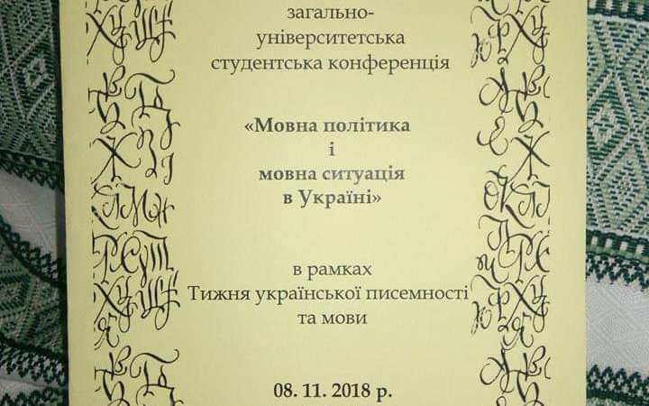 Уже стало традицією щорічно в рамках проведення Тижня української писемності та мови, приуроченого до Дня української писемності, який відзначаємо 9 листопада, проводити загальноуніверситетську студентську конференцію “Мовна політика і мовна ситуація в Україні”. Організатором цього заходу виступає кафедра української мови Факультету філології. Цьогоріч робота конференції проходила в шести секціях, якими керували викладачі кафедри Ірина Бабій, Валентина Ґрещук, Ірина Джочка, Наталія Іванишин, Любов Пена, Василь Пітель, Віра Пітель, Оксана Семенюк, Роксолана Стефурак, Оксана Ципердюк.