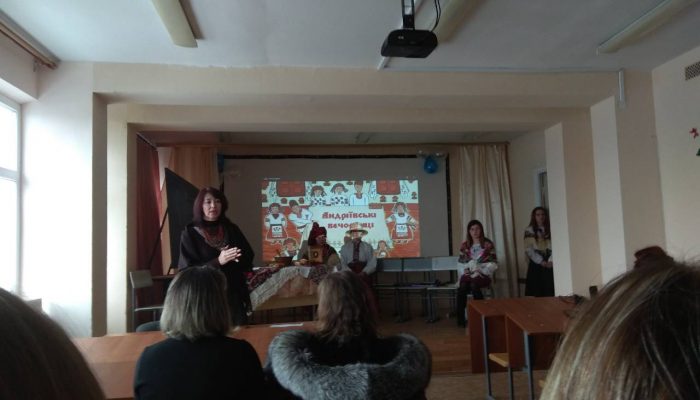 За допомогою методів бесіди, ілюстративного та дослідницького, прийомів аналізу, синтезу, абстрагування, узагальнення студенти продемонстрували, що важливо цінувати традиції, а саме святкування «Андріївських вечорниць». Колоритний діалект ґаздинь та молодиць, мелодійний спів, ворожіння та відповідні реквізити допомогли зануритись у атмосферу тодішніх вечорниць.