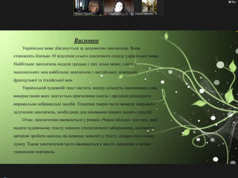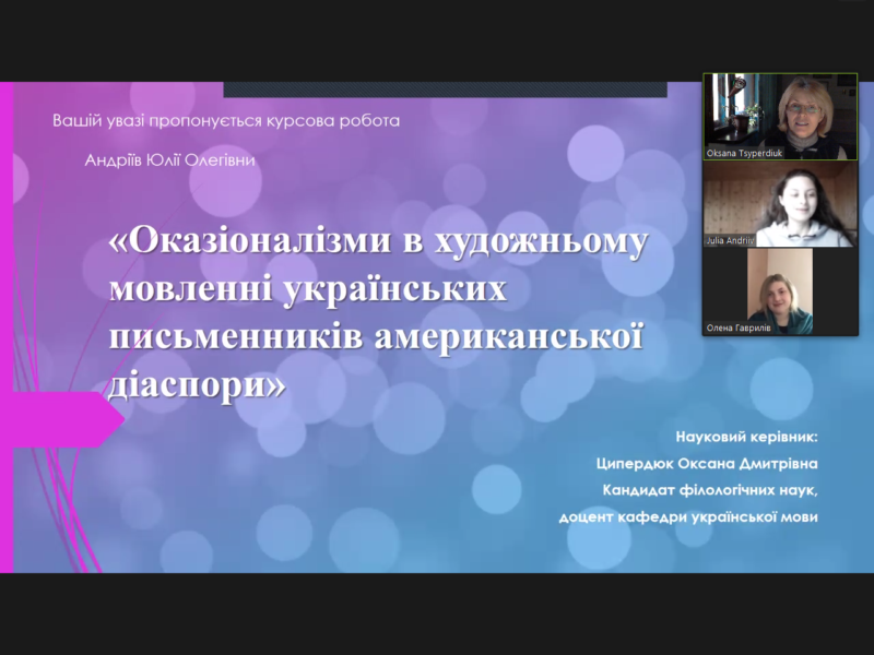 Сьогодні, 30 грудня, представляли свої наукові напрацювання з сучасної української мови та методики її викладання студенти денної та заочної форм навчання (комісія: доцентки Брус М.П., Пена Л.І., Ципердюк О.Д.). Юні дослідниці продемонстрували добрий рівень написання робіт, обізнаність із новітніми досягненнями в галузі лінгвістики та методики, уміння репрезентувати результати своїх досліджень.