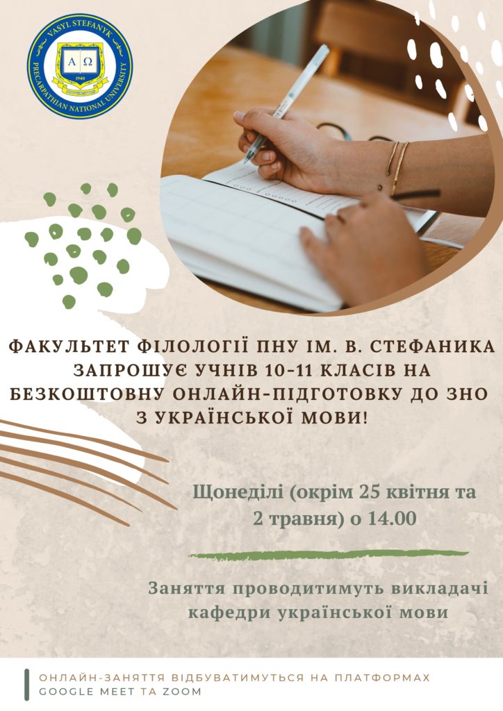 Факультет філології ПНУ імені В. Стефаника запрошує учнів 10-11 класів на безкоштовну онлайн-підготовку до ЗНО з української мови! Заняття вестимуть викладачі кафедри української мови з початку березня 2021 року щонеділі (окрім 25 квітня та 2 травня) о 14.00 відповідно до Читати далі