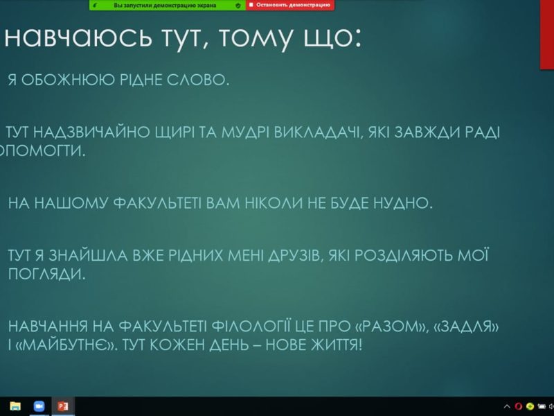 Бакалавриня поділилася своїм досвідом навчання на Факультеті філології, розповіла про яскраве, творче, насичене різноманітними подіями студентське життя і заохотила старшокласників до вступу в нашу Альма Матер, а також подякувала своїй учительці української мови та літератури Гавриш Ганні Василівні за допомогу в підготовці заходу та влучні поради.