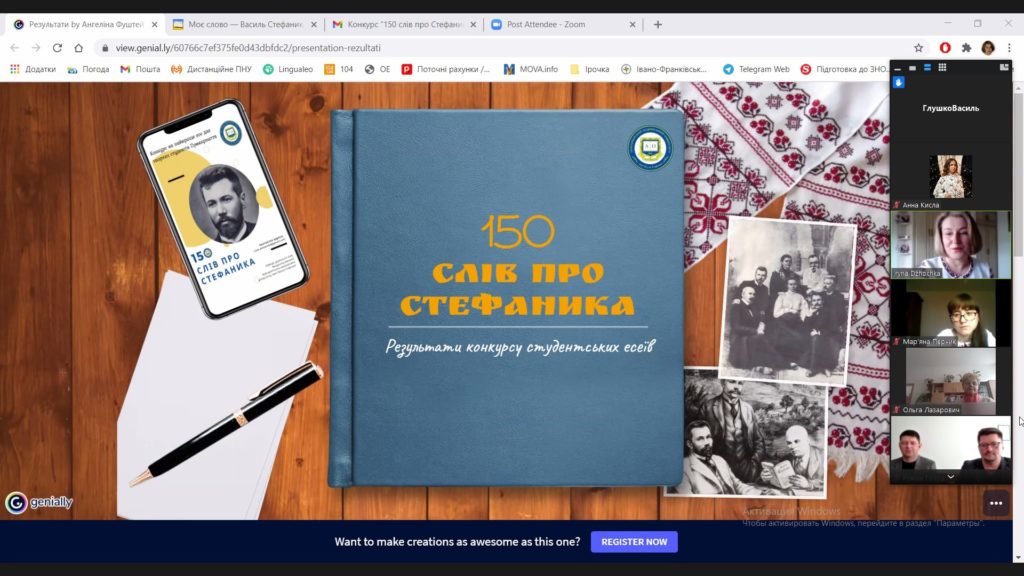У четвер 15 квітня, о 15 годині, відбудеться онлайн-зустріч, на якій будуть оголошені результати конкурсу есеїв для творчих студентів Прикарпаття “150 слів про Стефаника”. Запрошуємо конкурсантів та всіх охочих! До урочистого заходу долучайтеся за цим покликанням: https://us04web.zoom.us/j/77510444462?pwd=R3dNR2lIU2lLcDJDMGZFSlJEdEM3dz09