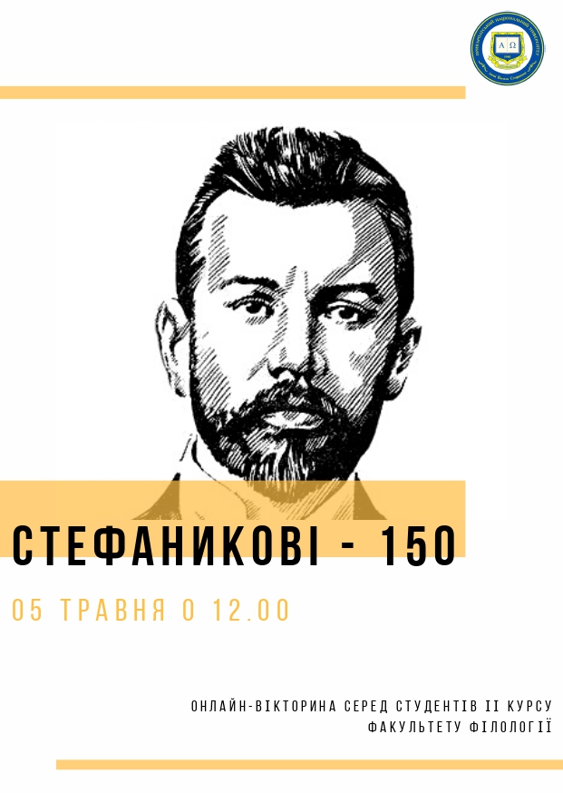 Тра 05 Онлайн-вікторина “Стефаникові – 150” 05 травня о 12.00 у рамках святкування ювілею Василя Стефаника відбудеться онлайн-вікторина “Стефаникові – 150” серед студентів ІІ курсу Факультету філології. Запрошуємо охочих приєднатися за покликанням: https://meet.google.com/frn-rpqu-nmu