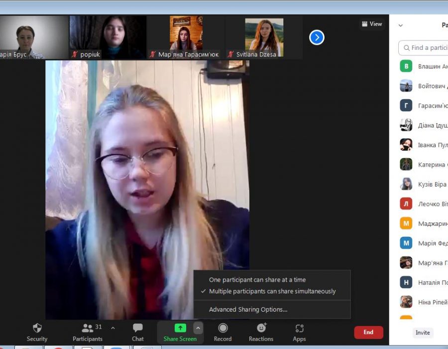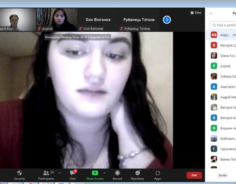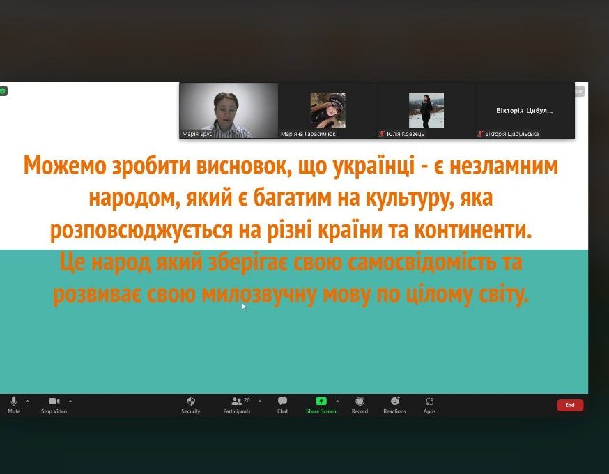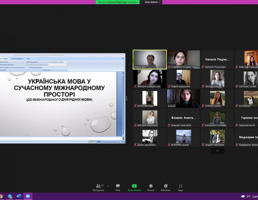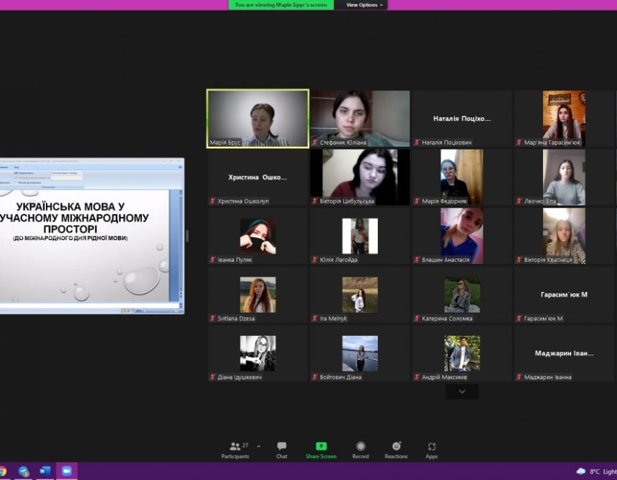 Викладачка кафедри української мови Брус Марія Петрівна провела відеоконференцію на тему «Українська мова в сучасному міжнародному просторі» зі студентами другого курсу факультету філології, приурочену Міжнародному дню рідної мови. Під час зустрічі магістрантка першого курсу Поп’юк Марина ознайомила всіх із історією святкування цього дня та з його актуальністю на сучасному етапі формування української держави.