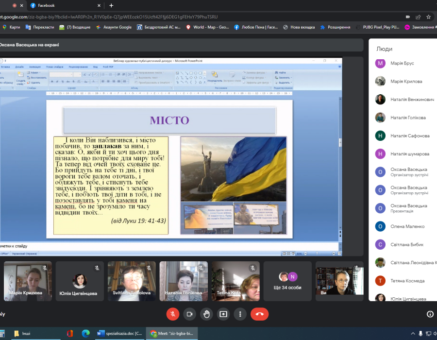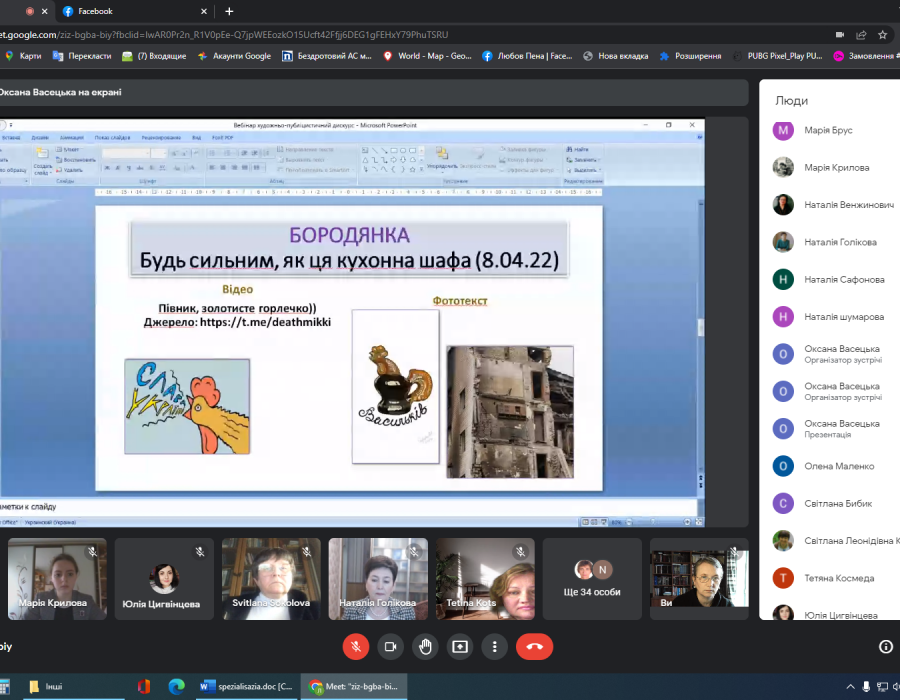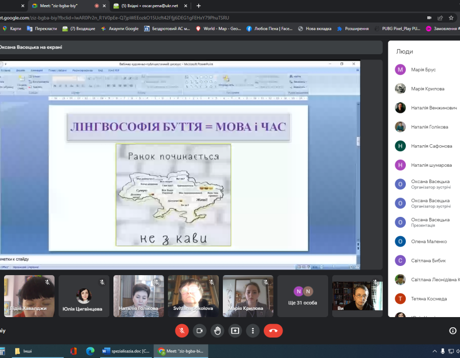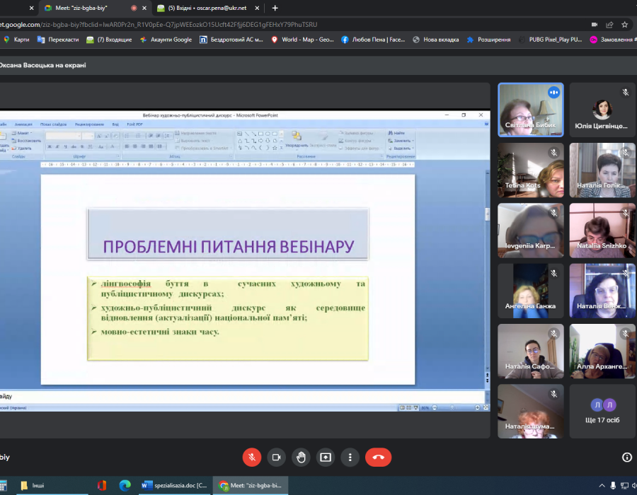 21 квітня відділ стилістики, культури мови та соціолінгвістики Інституту української мови НАН України організував вебінар «Художньо-публіцистичний дискурс у сучасній мовно-культурній трансформації України», який об’єднав науковців зі всієї України. Виголошені виступи стосувалися актуальних питань сучасної лінгвостилістики, зокрема лінгвософського сприймання й осмислення буття, його нових реалій. До присутніх звернувся директор Інституту української мови професор Павло Гриценко, який серед іншого наголосив на важливості фіксування індивідуальних рецепцій сучасних явищ.