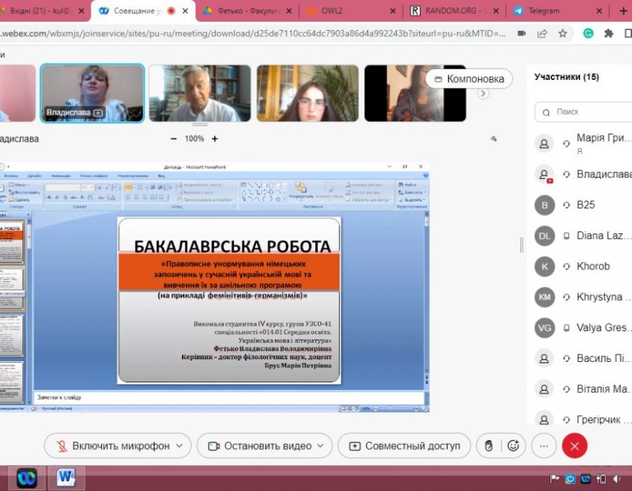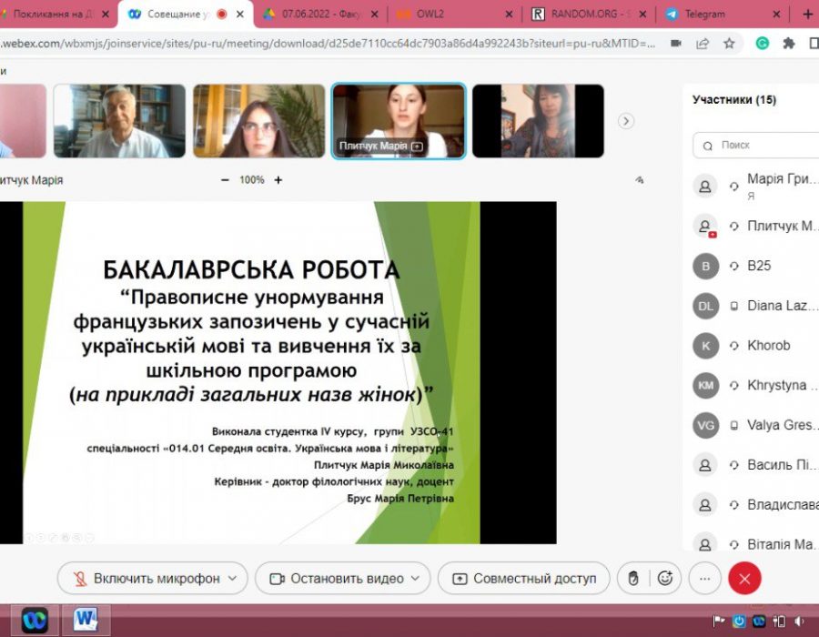 На Факультеті філології розпочала роботу Державна екзаменаційна комісія у складі завідувача кафедри української літератури, професора Степана Хороба (голова), доцента кафедри української мови Василя Пітеля (екзаменатор з української мови) й доцентки кафедри загального та германського мовознавства Валентини Ґрещук (екзаменаторка з методики викладання української мови). 7 і 8 червня студенти спеціальності 014 Середня освіта (Українська мова і література) заочної форми навчання захистили бакалаврські роботи й склали іспит з української мови з методикою викладання.
