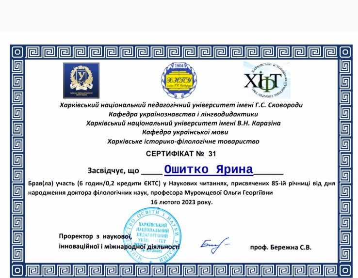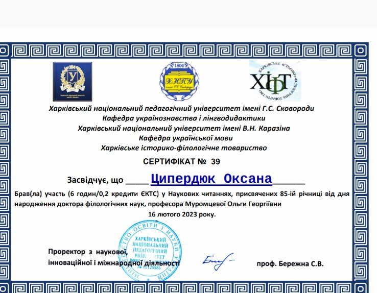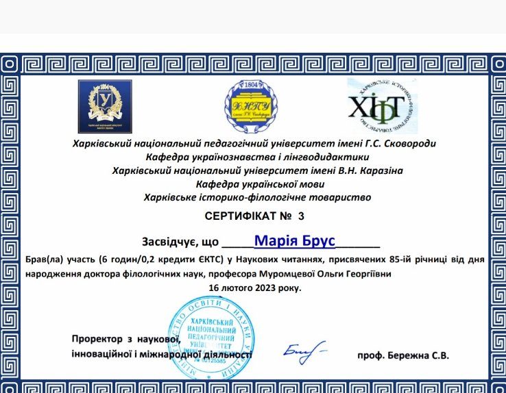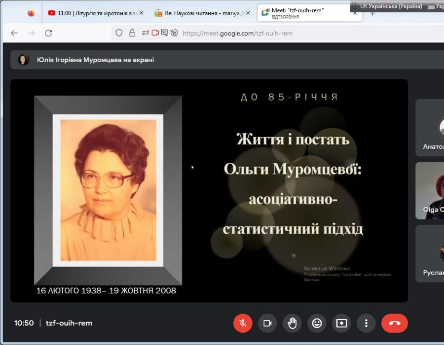 Доктор філологічних наук, завідувач кафедри української мови Прикарпатського національного університету імені Василя Стефаника Марія Брус, доцент кафедри української мови Оксана Ципердюк і студентка 4 курсу факультету філології Ярина Ошитко взяли участь у наукових читаннях, присвячених 85-ій річниці від дня народження доктора філологічних наук, професора Муромцевої Ольги Георгіївни, які відбулися 16 лютого 2023 року в Харкові віддалено.