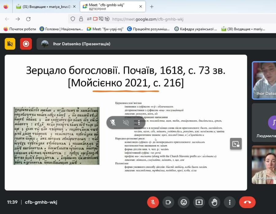 Робота секційних засідань Міжнародної наукової конференції продовжилася 8 вересня 2023 року. На першому секційному засіданні, головою якого була кандидатка філологічних наук, старша наукова співробітниця відділу діалектології Інституту української мови НАН України Рябець Людмила Віталіївна, провідними вченими України були зголошені доповіді: «Концепт душа крізь призму творів І. Галятовського» (Скаб М. В., Скаб М.С.), «Назви осіб жіночого роду в Добриловому Євангелії 1164 року: етимологічний, словотвірний і лексичний аспекти» (Брус М.П.), «Мислеобраз «молитва серця» у Т. Шевченка в порівнянні з «молитвою слова» (Єрмоленко С.Я.) та ін.