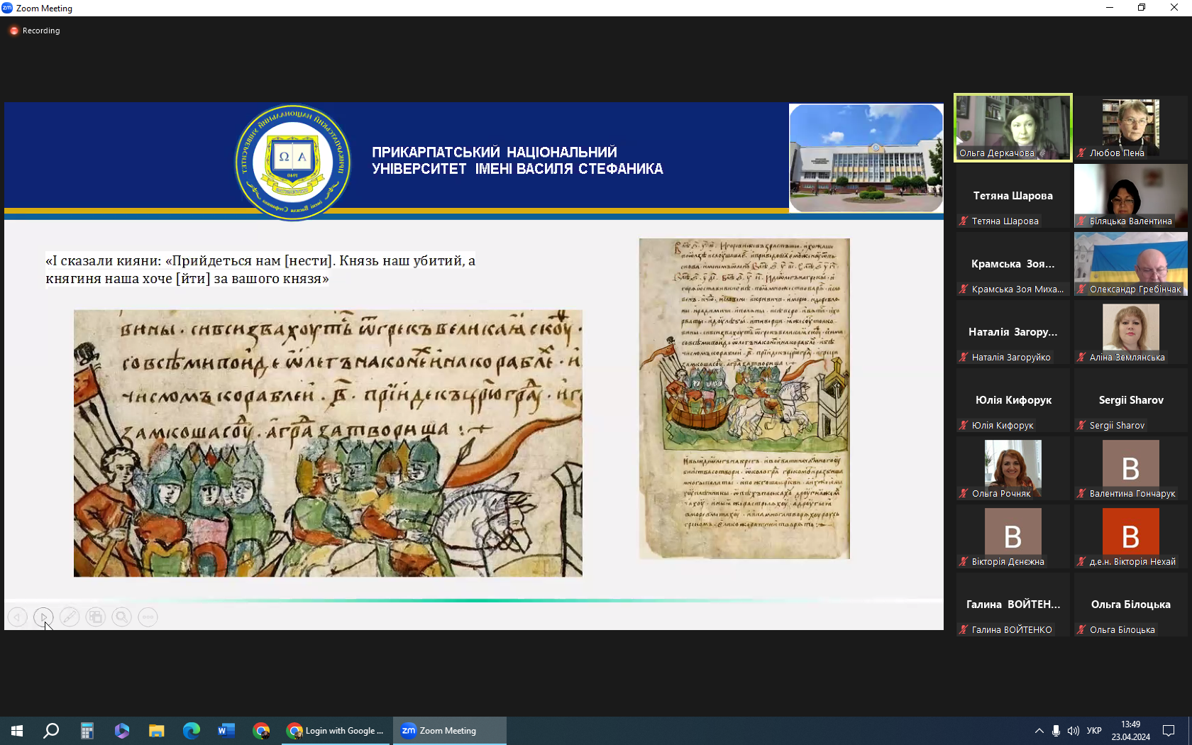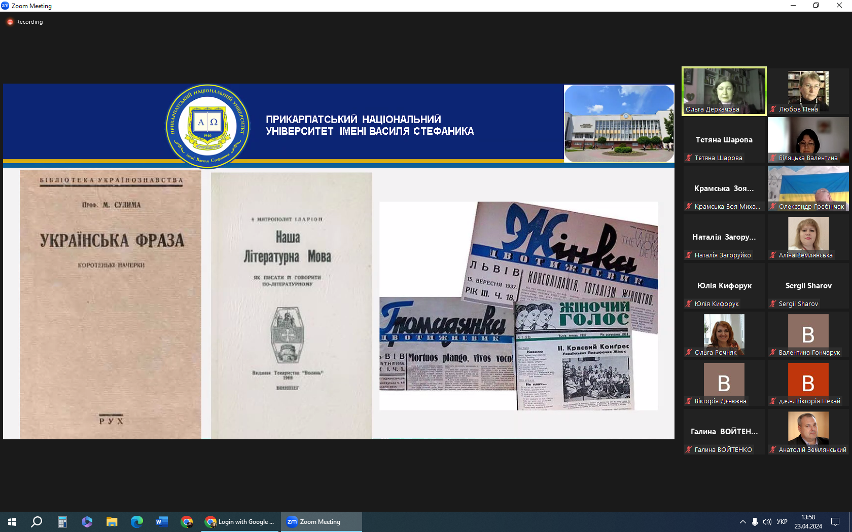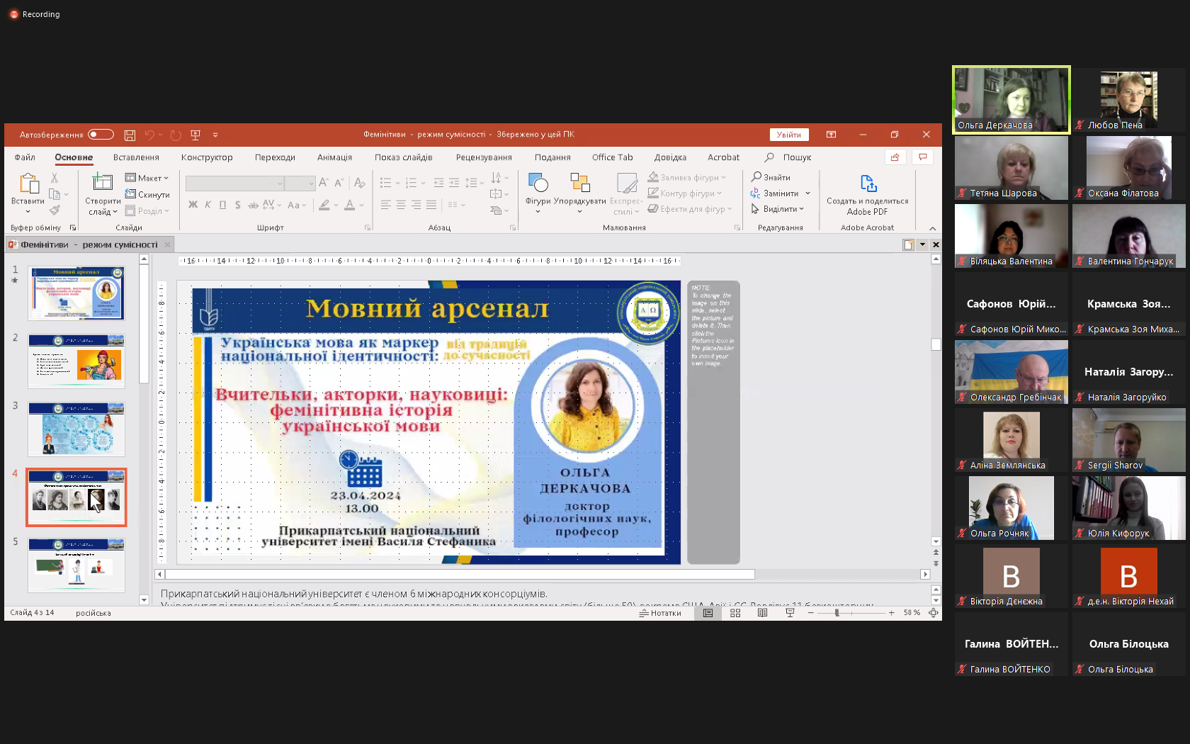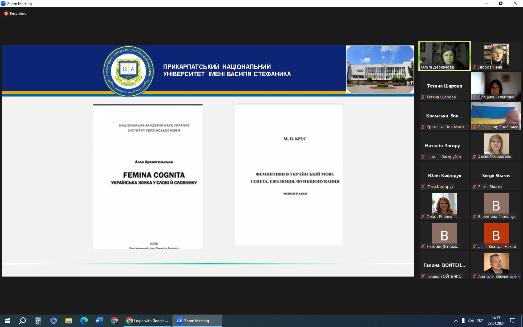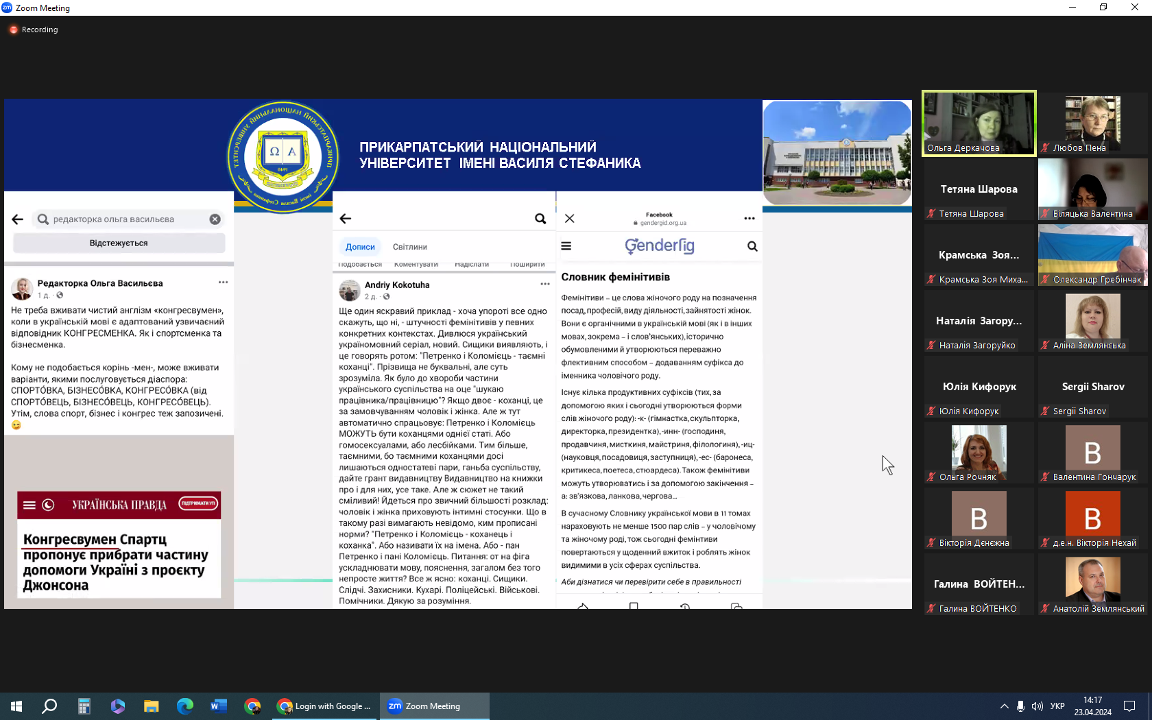 В онлайн-заході взяли участь завідувачка нашої кафедри Марія Брус, про наукові здобутки якої в царині діахронного й синхронного дослідження фемінітивів неодноразово згадувала доповідачка, та доцентки Любов Пена і Оксана Ципердюк.