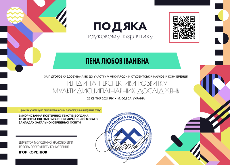 Студентка ІІІ курсу спеціальності 014 «Середня освіта (Українська мова і література)» Тетяна Слободян (науковий керівник – доц. Любов Пена) апробувала результати своєї курсової роботи з методики викладання української мови, взявши участь у V Міжнародній студентській науковій конференції «Тренди та перспективи розвитку мультидисциплінарних досліджень».