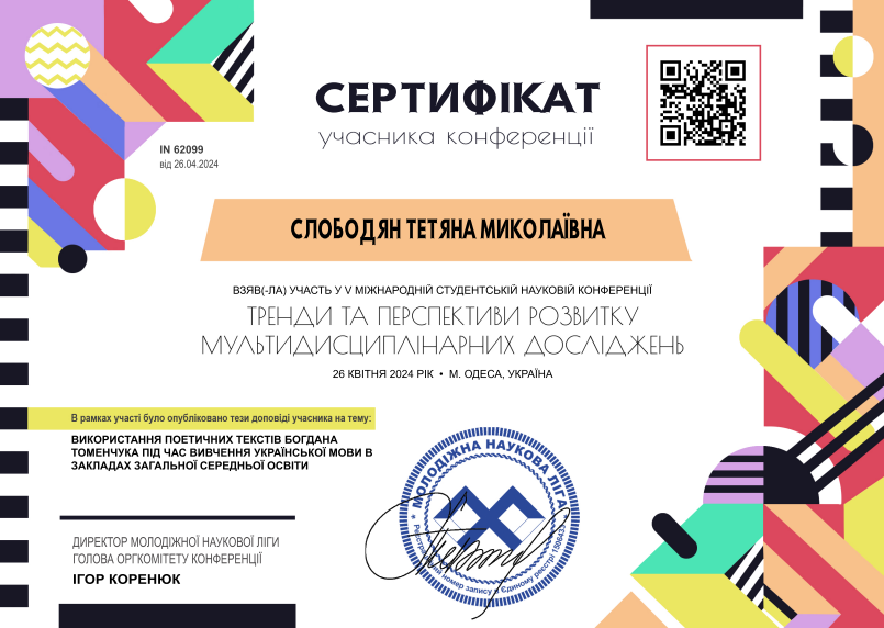 Тези доповіді «Використання поетичних текстів Богдана Томенчука під час вивчення української мови в закладах загальної середньої освіти» опубліковані у збірнику матеріалів конференції.