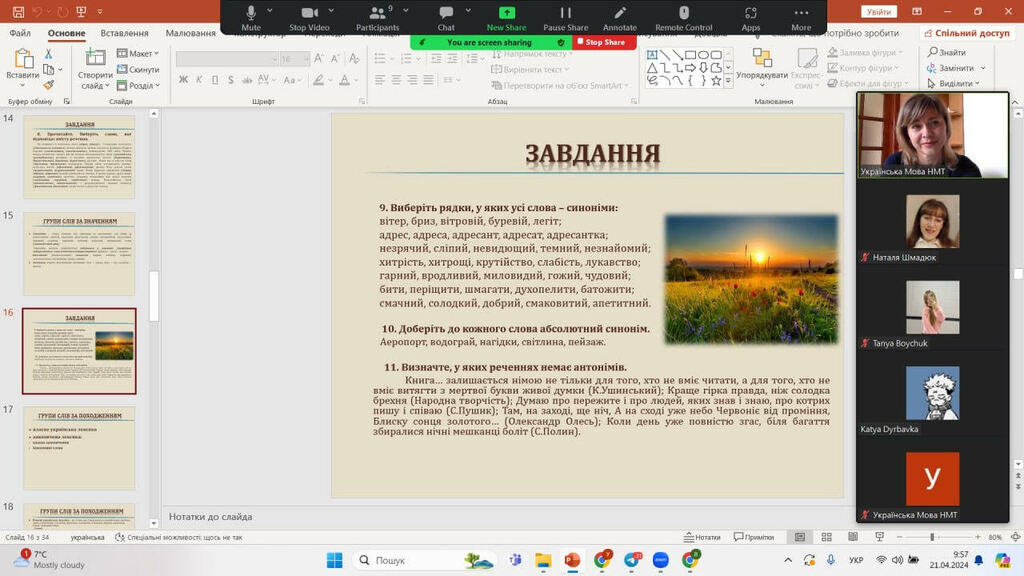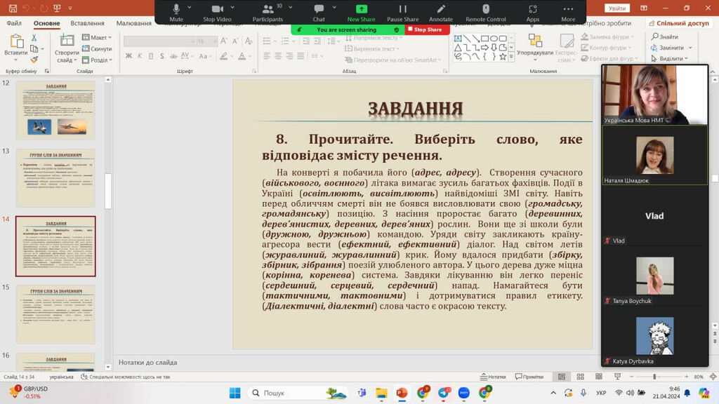 21 та 27 квітня доцентка кафедри української мови Віра Пітель провела онлайн-заняття з української мови в рамках безкоштовної програми підготовки випускників України до національного мультипредметного тесту. Майбутні студенти мали змогу повторити навчальний матеріал із розділів «Лексикологія» та «Фразеологія», узагальнити й систематизувати свої знання. Абітурієнти активно долучалися до виконання завдань, доповнювали, висловлювали міркування з приводу різних мовних явищ. Приємно відзначити, що відповіді багатьох учнів засвідчили наявність у них філологічного хисту.