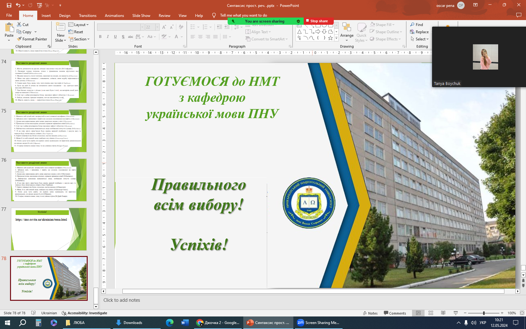 11-12 травня відбулися чергові безкоштовні онлайн-заняття, які проводять викладачі кафедри української мови. З майбутніми абітурієнтами працювала доц. Любов Пена. Школярі мали змогу повторити навчальний матеріал із розділу «Синтаксис простого речення». Присутні охоче долучалися до виконання різнотипних завдань, доповнювали, висловлювали міркування щодо різних мовних явищ.