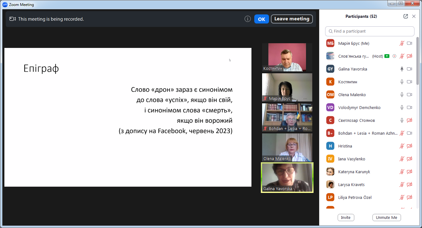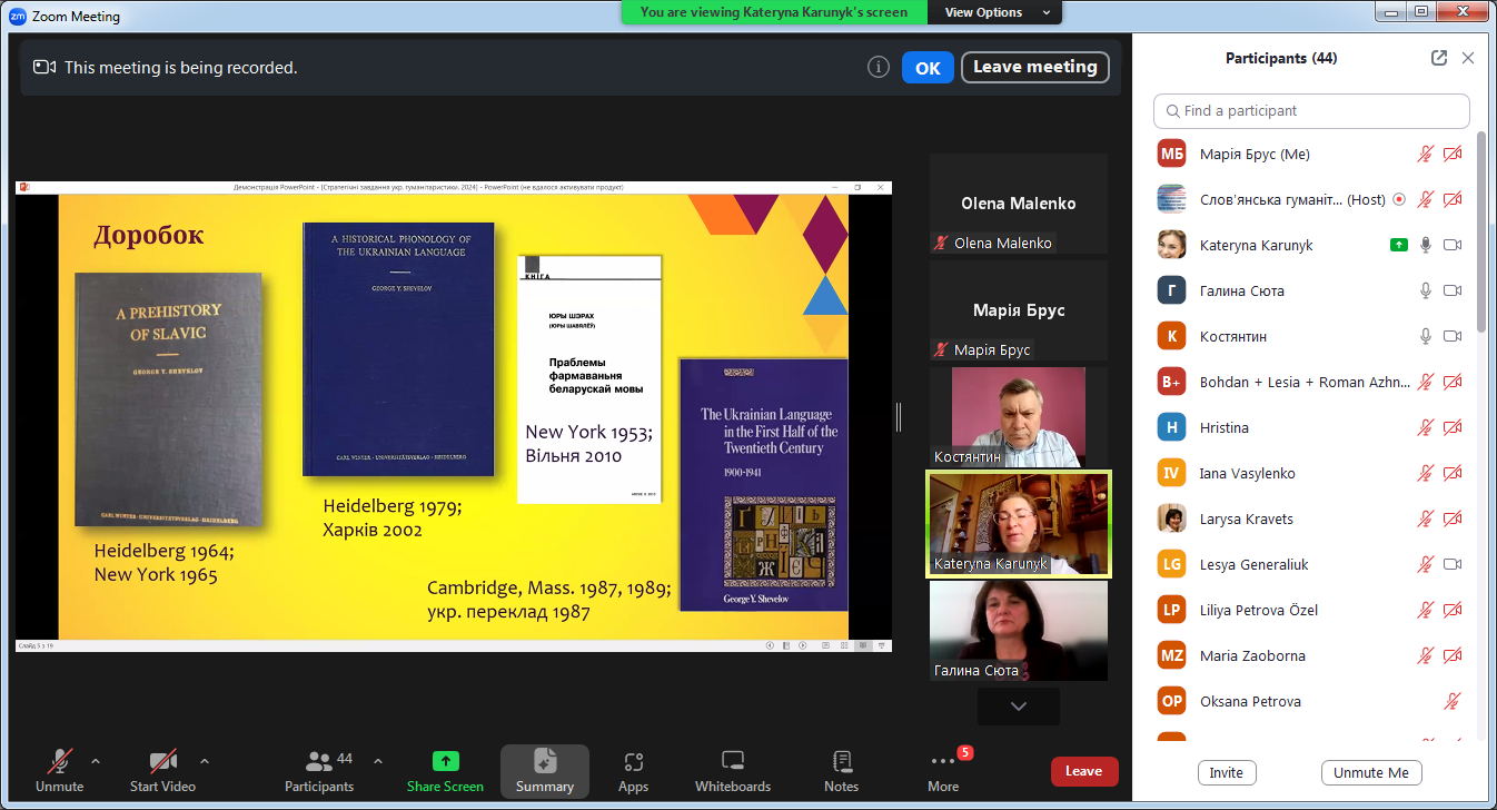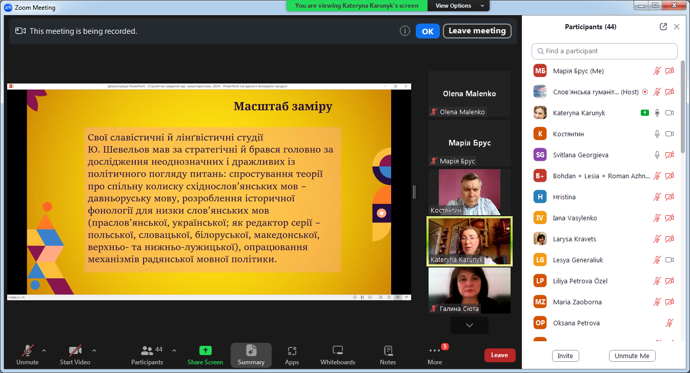 На пленарному засіданні з доповідями виступили: директор Інституту мовознавства імені О. О. Потебні Ажнюк Богдан «Мова під час війни: у пошуках нових відповідей на давні питання», головний науковий співробітник Національного інституту стратегічних досліджень Яворська Галина «Мова під час війни: у пошуках нових відповідей на давні питання», завідувач кафедри історії і теорії літератури Шуменського університету імені Єпископа Константина Преславського Цанов Страшимир «Рана» Захарія Карабашлієва— жанр, наратив і сенс», провідний науковий співробітник відділу зарубіжних і слов’янських літератур Інституту літератури ім. Т. Г. Шевченка НАН України Генералюк Леся «Постать слов’янофіла Юрія Крижанича в текстах Максиміліана Волошина 1918 – 1926 РР.», доцент кафедри українознавства Харківського національного університету імені В. Н. Каразіна Каруник Катерина «Стратегічні завдання української гуманітаристики за Юрієм Шевельовим»; декан українського мовно-літературного факультету імені Г.Ф. Квітки-Основ’яненка Харківського національного педагогічного університету імені Г. С. Сковороди Голобородько Костянтин «Суспільне значення й стратегічна вага лінгвістичних експертиз в умовах воєнного стану»; провідний науковий співробітник Інституту української мови НАН України Сюта Галина «Українська мова в час війни: (не)стійкість лінгвоментальних маркерів ідентичності!»