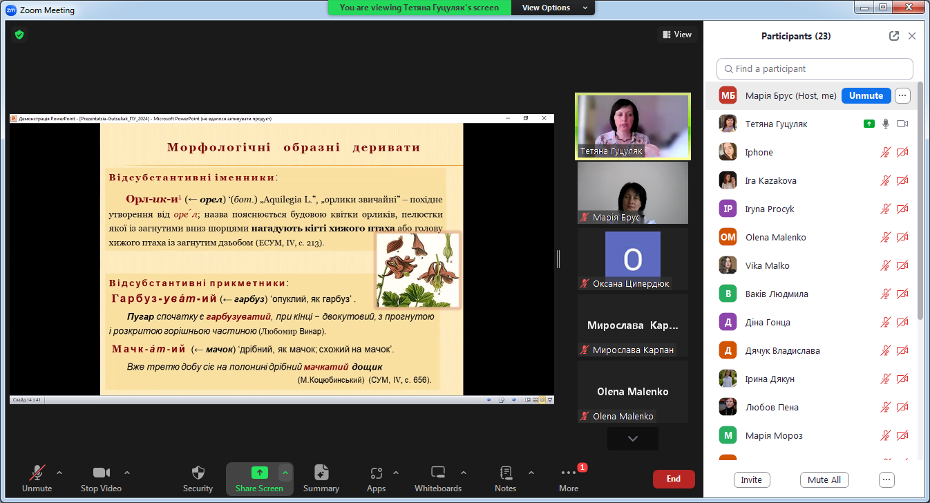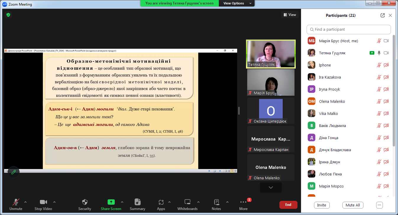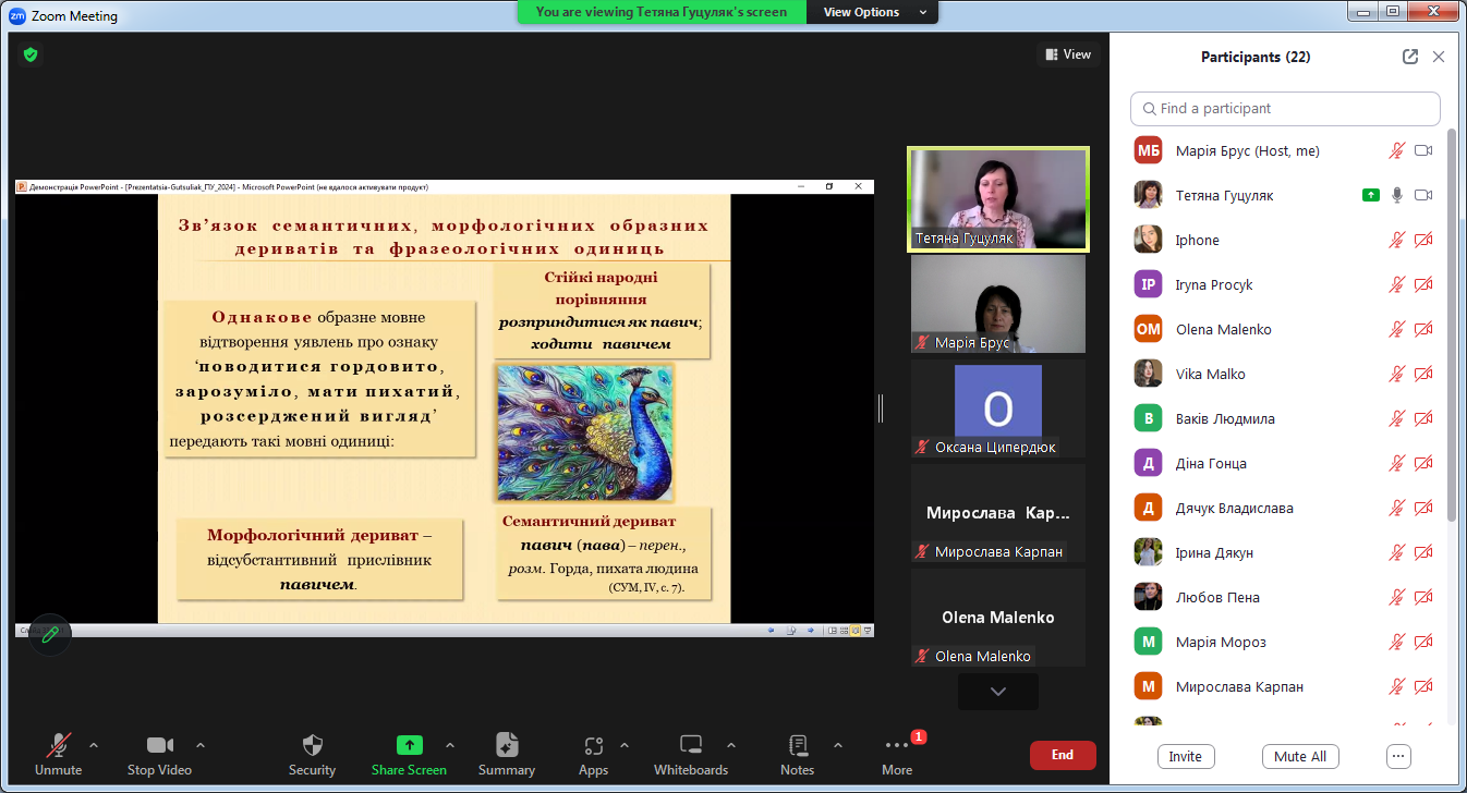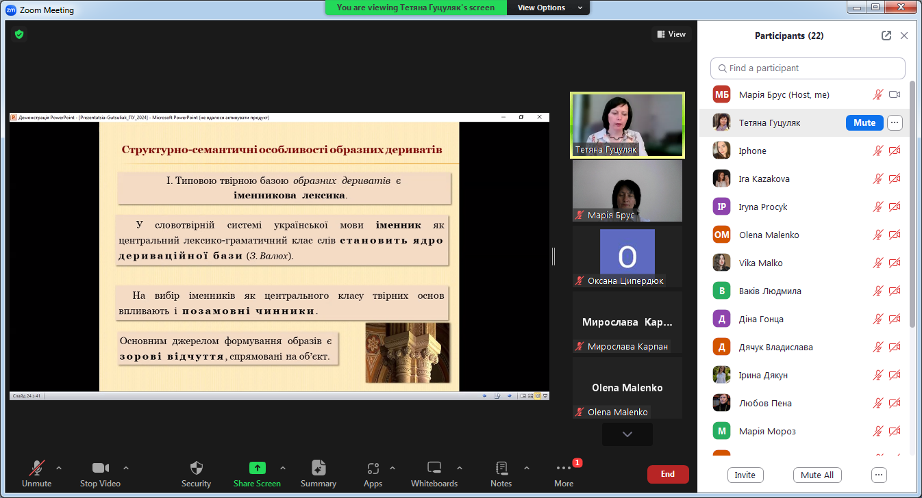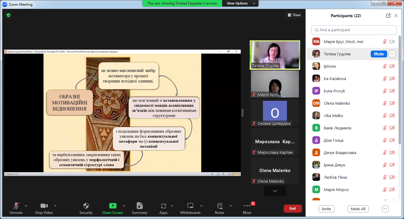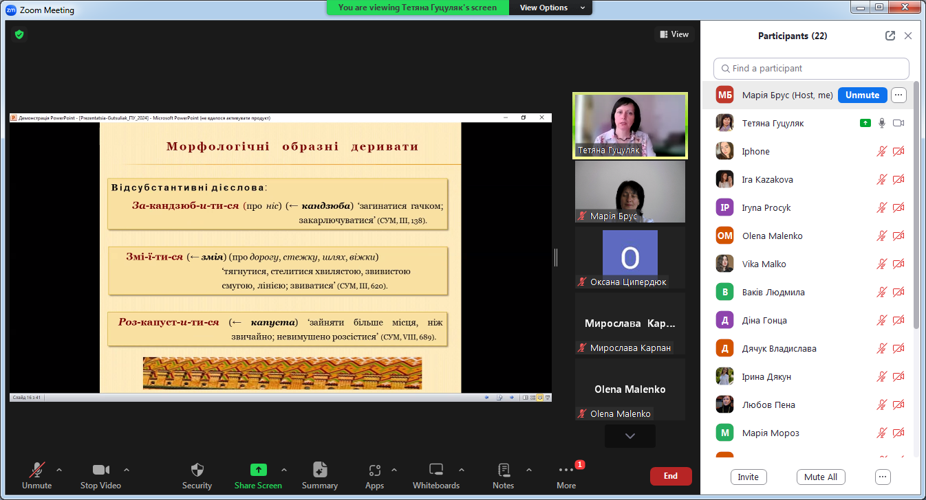 На запрошення кафедри української мови Прикарпатського національного університету імені Василя Стефаника для науково-педагогічних працівників і здобувачів освіти спеціальності 035 Філологія професорка Чернівецького національного університету імені Юрія Федьковича Гуцуляк Тетяна Євгенівна провела гостьову онлайн-лекцію на тему «Дериваційні процеси української мови у взаємозв’язку з образно-метафоричним світосприйняттям носіїв мови» (28 травня 2024 року, о 17.00 год).