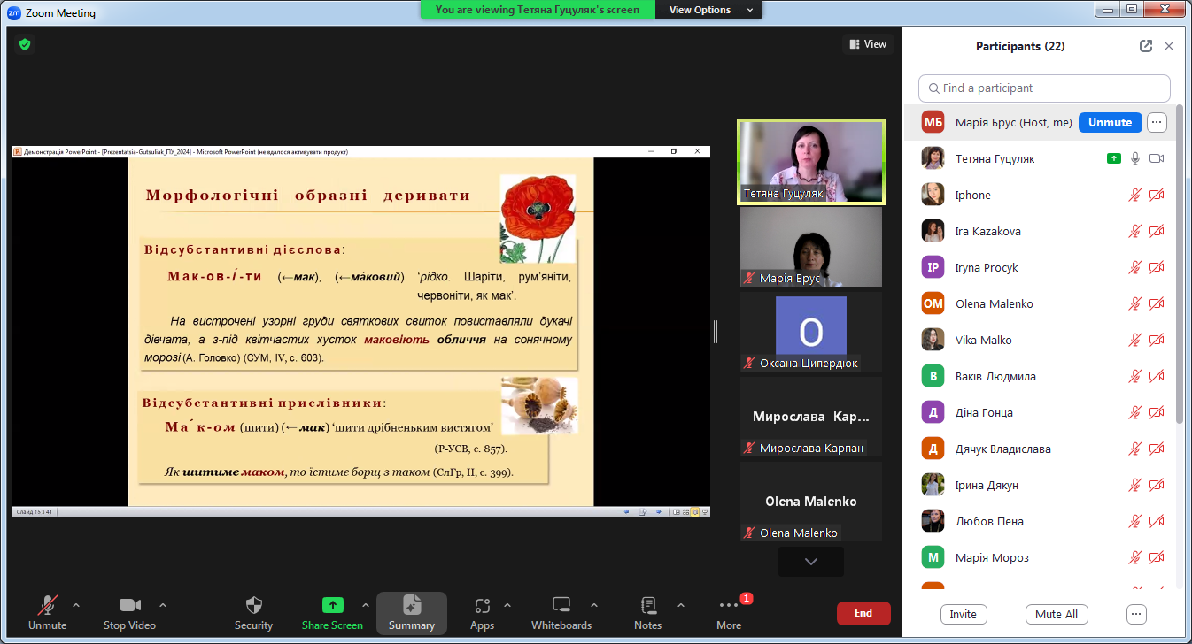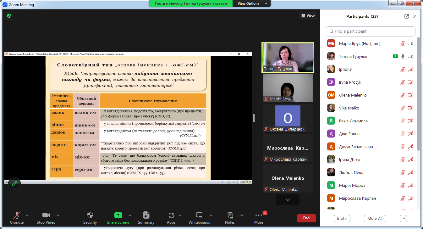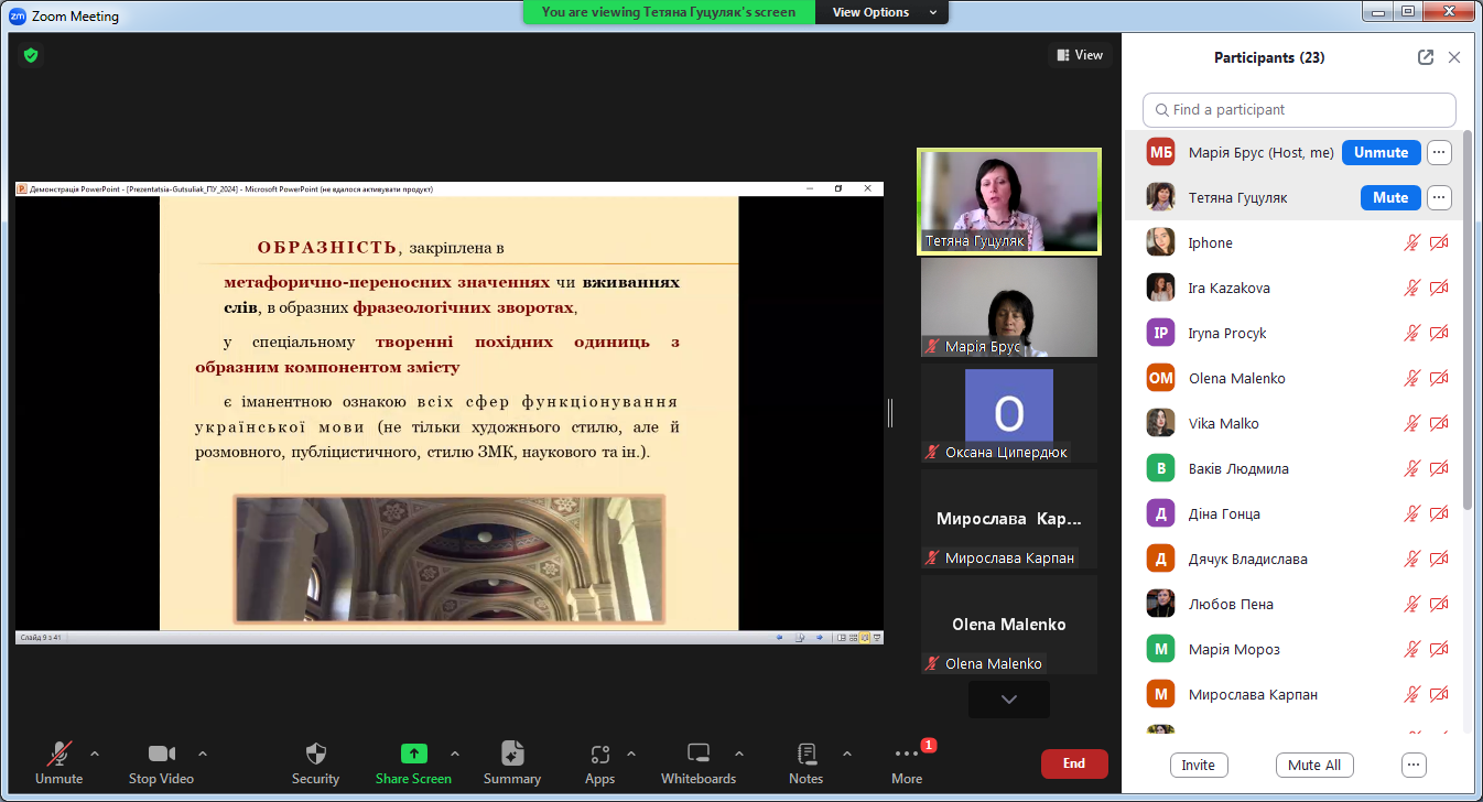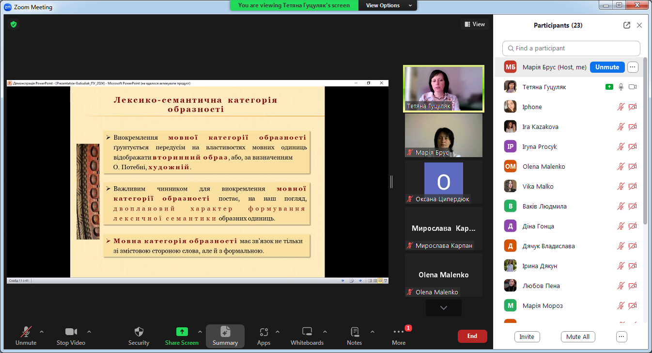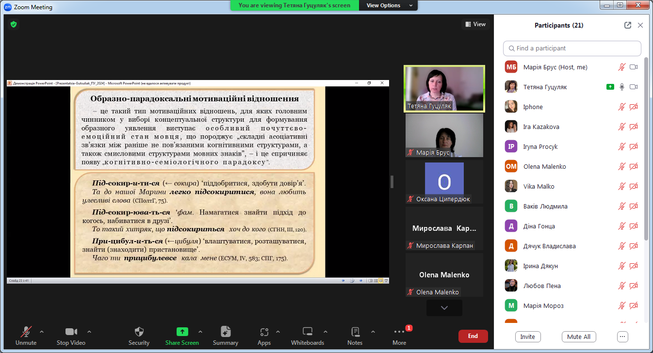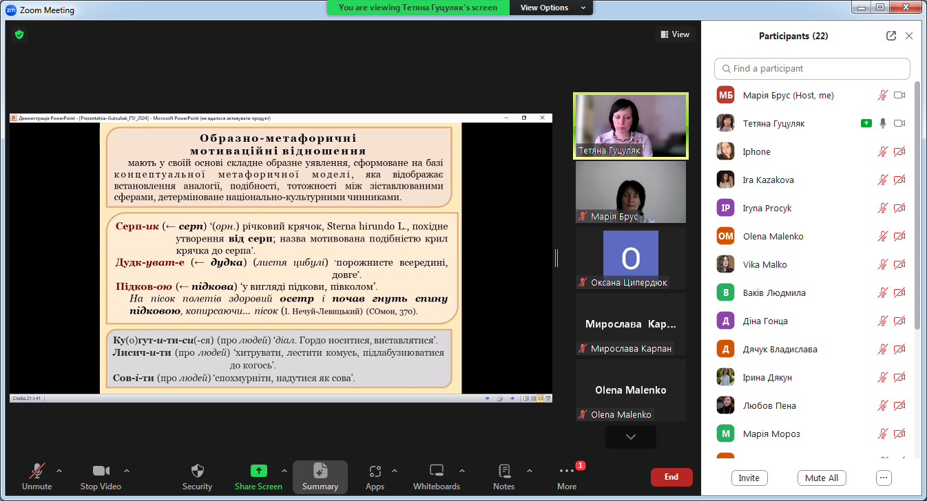 На запрошення кафедри української мови Прикарпатського національного університету імені Василя Стефаника для науково-педагогічних працівників і здобувачів освіти спеціальності 035 Філологія професорка Чернівецького національного університету імені Юрія Федьковича Гуцуляк Тетяна Євгенівна провела гостьову онлайн-лекцію на тему «Дериваційні процеси української мови у взаємозв’язку з образно-метафоричним світосприйняттям носіїв мови» (28 травня 2024 року, о 17.00 год).