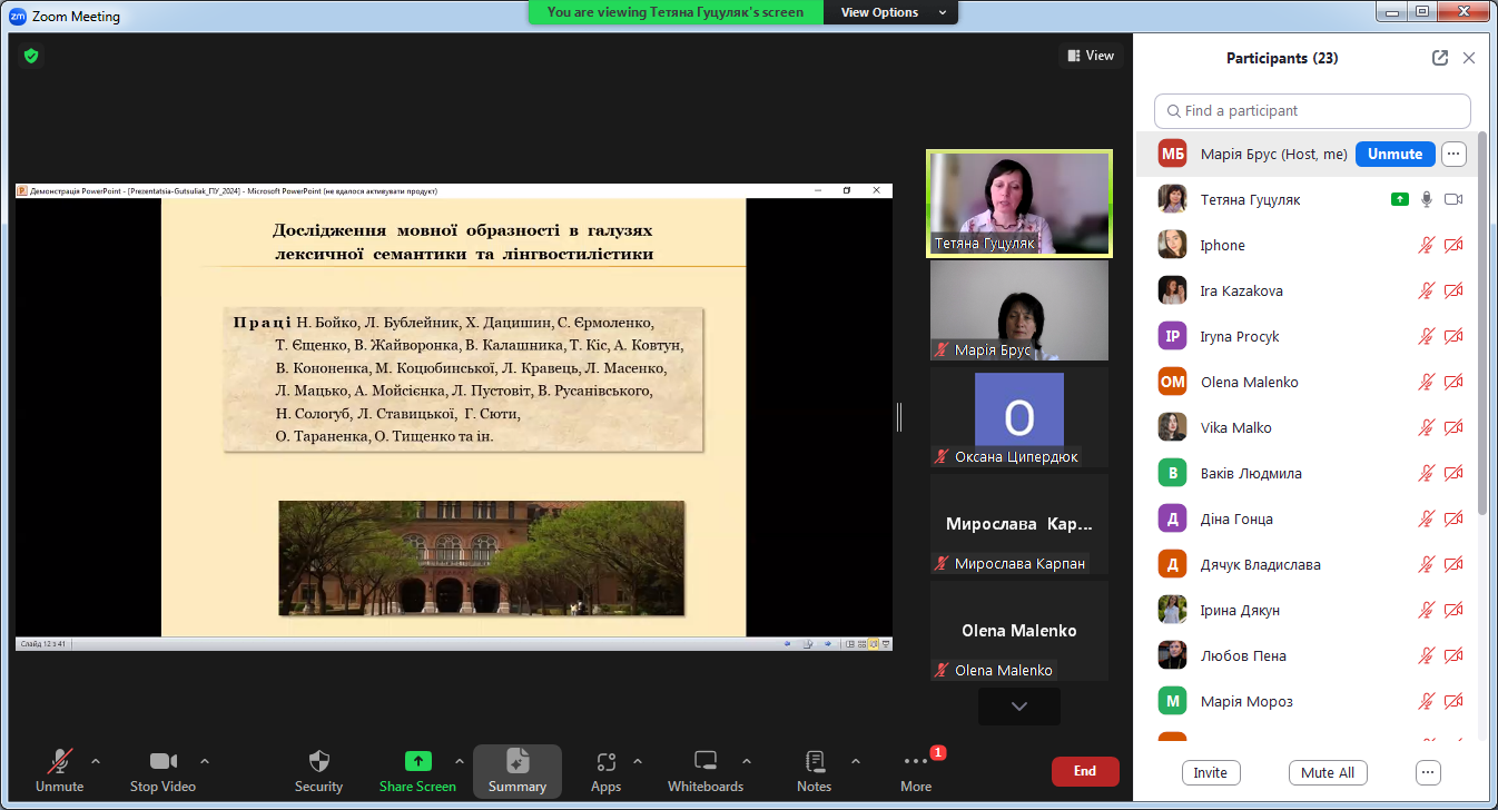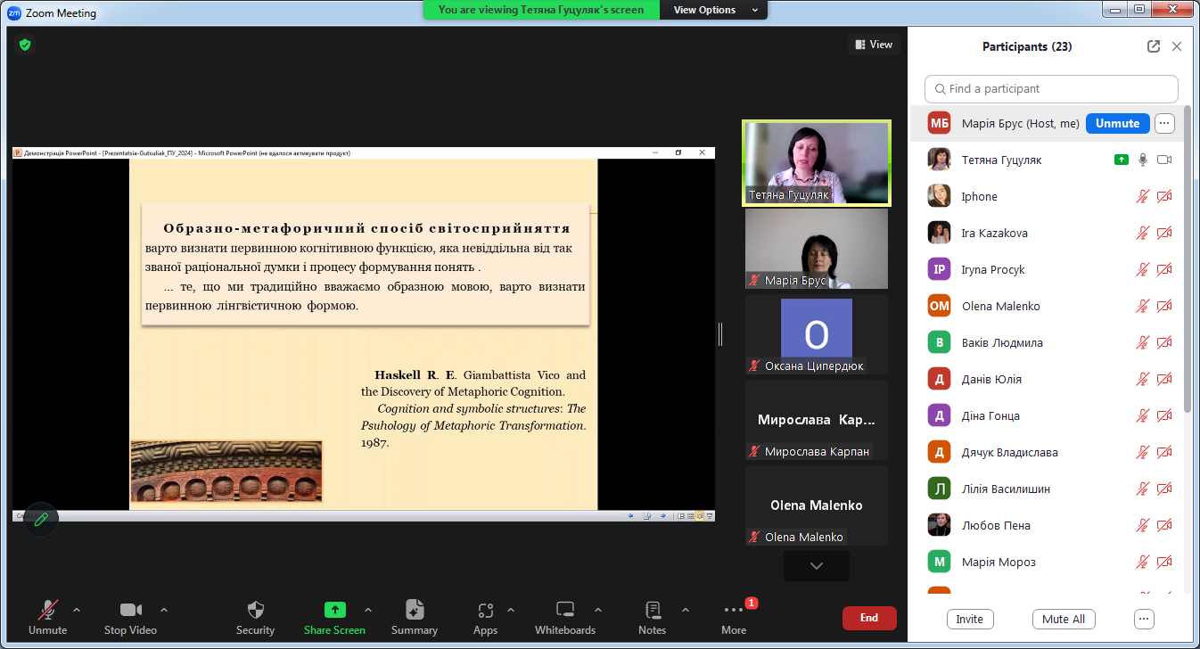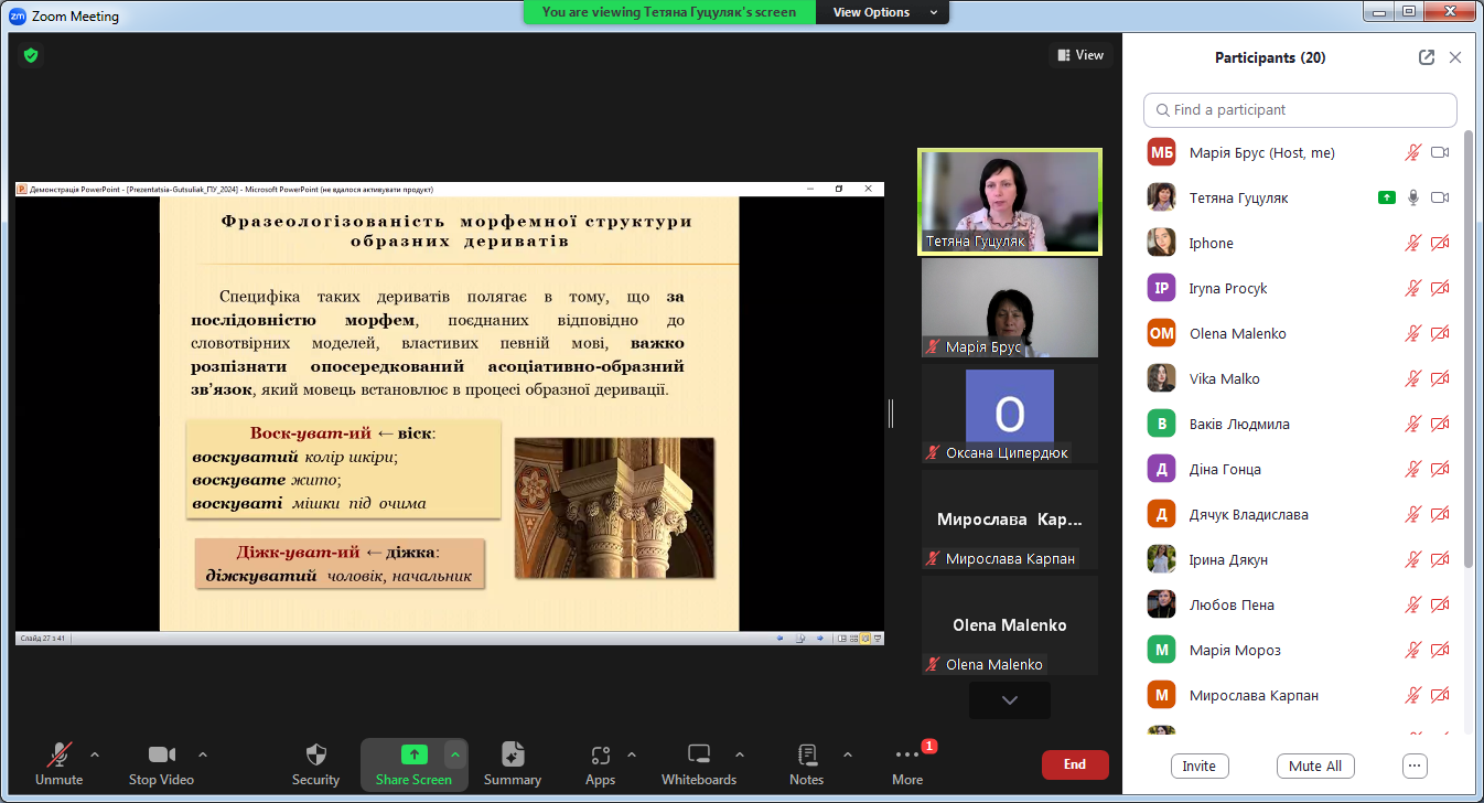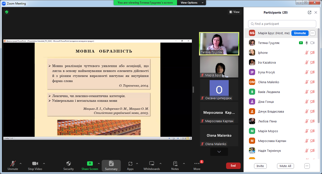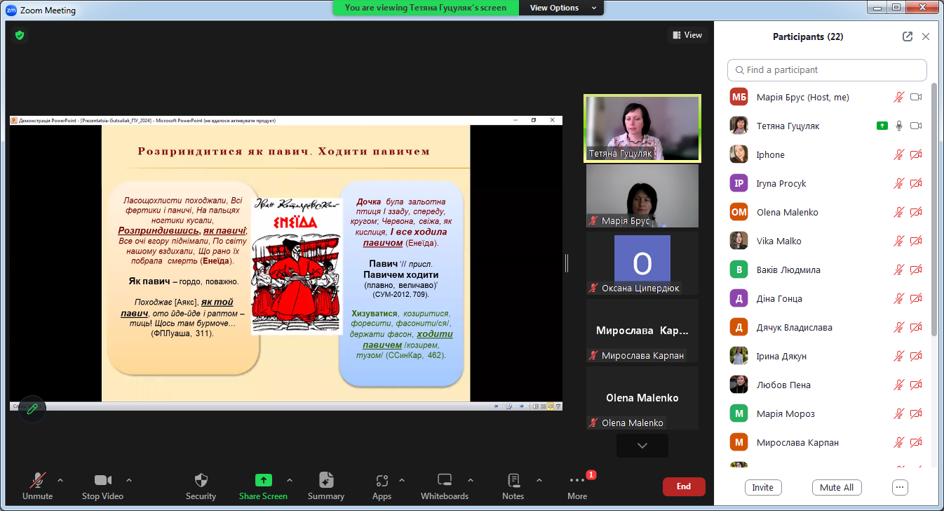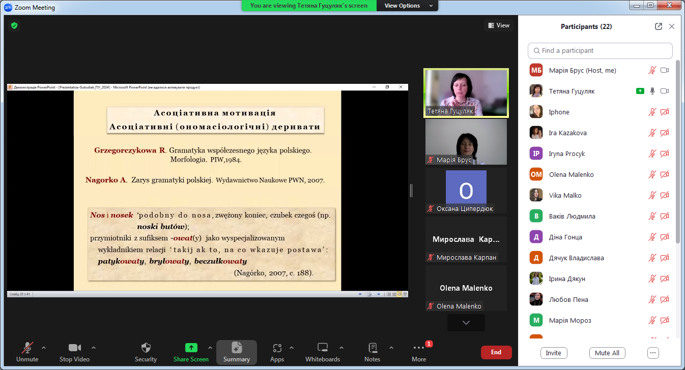 На запрошення кафедри української мови Прикарпатського національного університету імені Василя Стефаника для науково-педагогічних працівників і здобувачів освіти спеціальності 035 Філологія професорка Чернівецького національного університету імені Юрія Федьковича Гуцуляк Тетяна Євгенівна провела гостьову онлайн-лекцію на тему «Дериваційні процеси української мови у взаємозв’язку з образно-метафоричним світосприйняттям носіїв мови» (28 травня 2024 року, о 17.00 год).