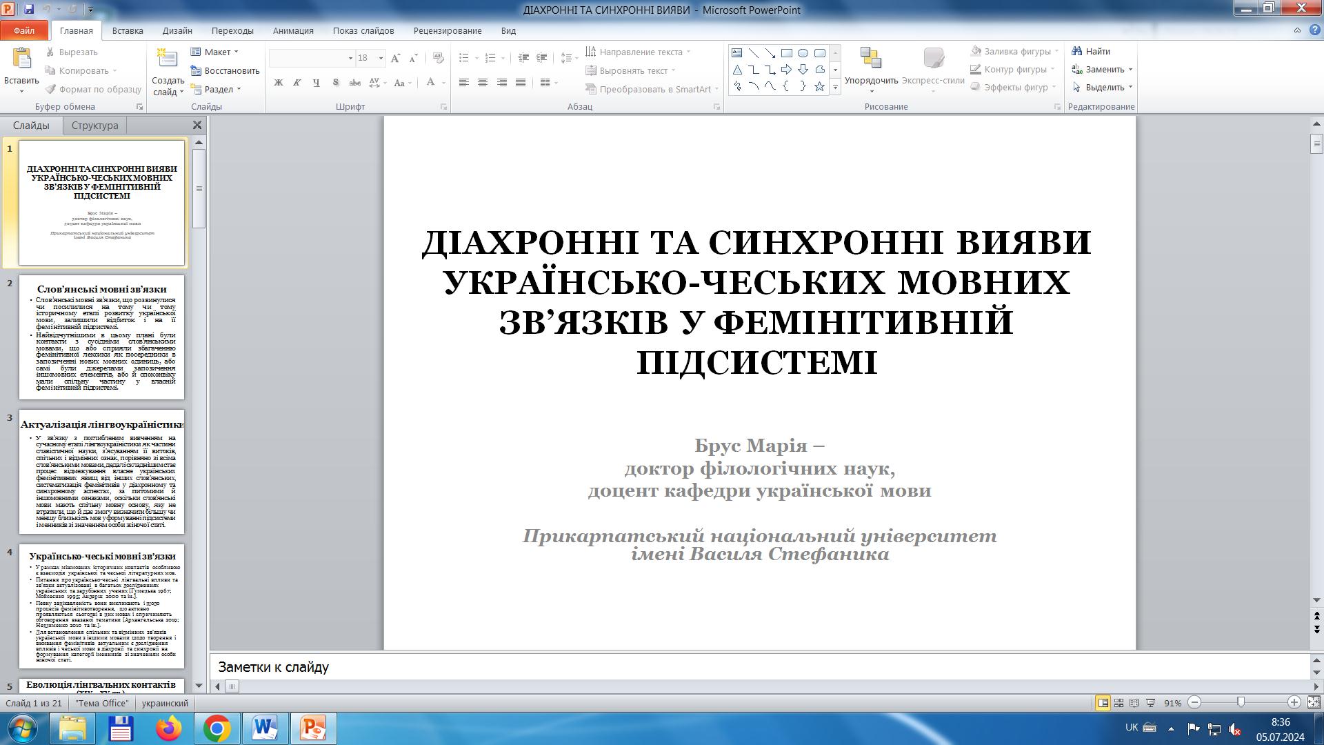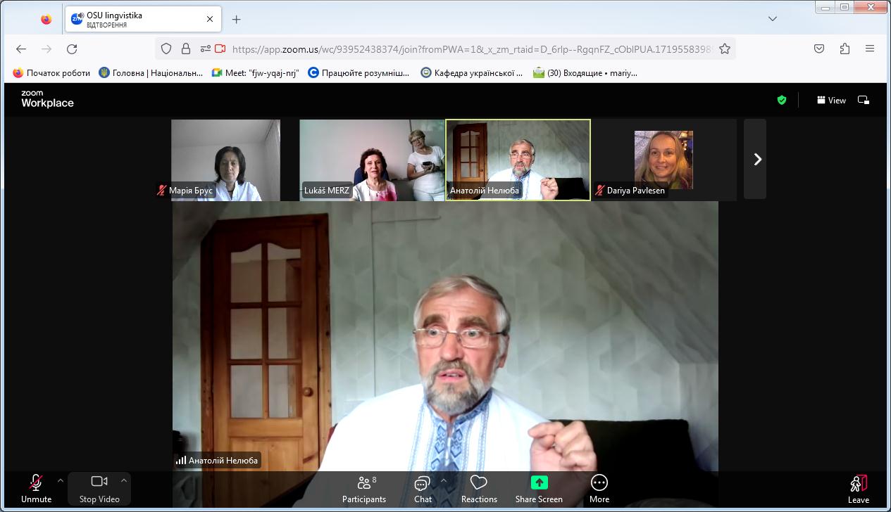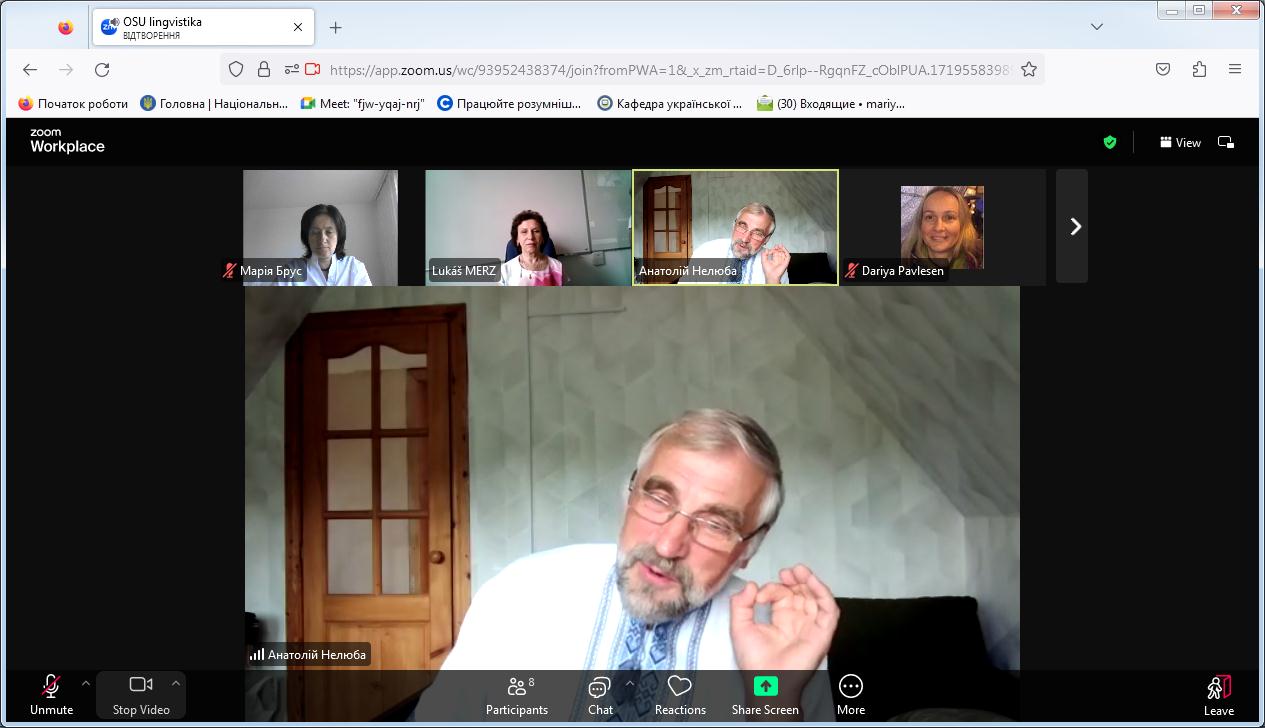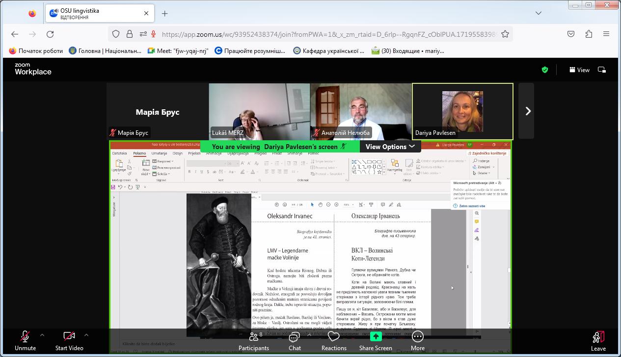 Доцентка розкрила питання про українсько-чеські мовні зв’язки і схарактеризувала фемінітиви й маскулінативи чеського походження, що ввійшли до українського лексикону в різні історичні періоди, стали частиною його активного або пасивного складу та залишили певне відбиття на фемінітивній підсистемі української мови. Зазначила, що перші такі запозичення з чеської мови з’явилися в українській мові ХІV – ХV ст., збільшилися в ХVІ – ХVІІ ст., частково поповнили українську лексику в новий та сучасний періоди, але переважно словами, мотивованими основами чеського походження.