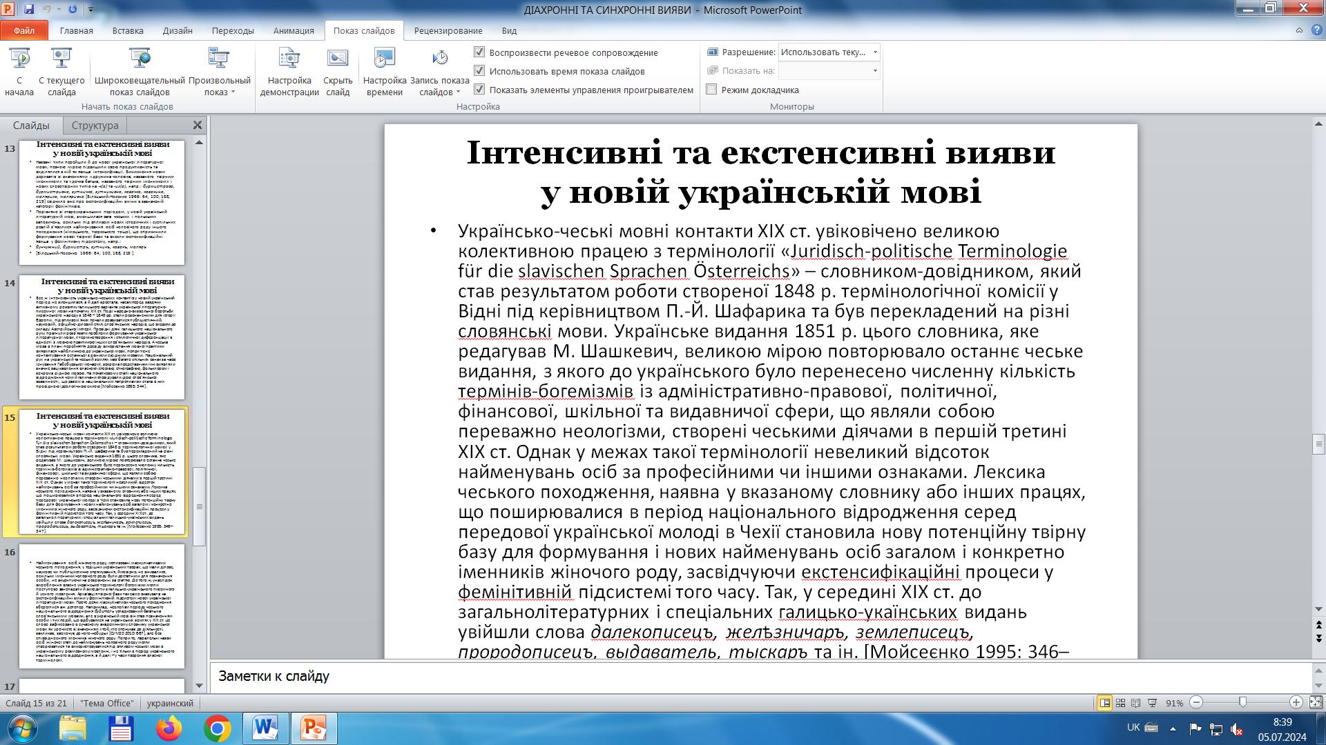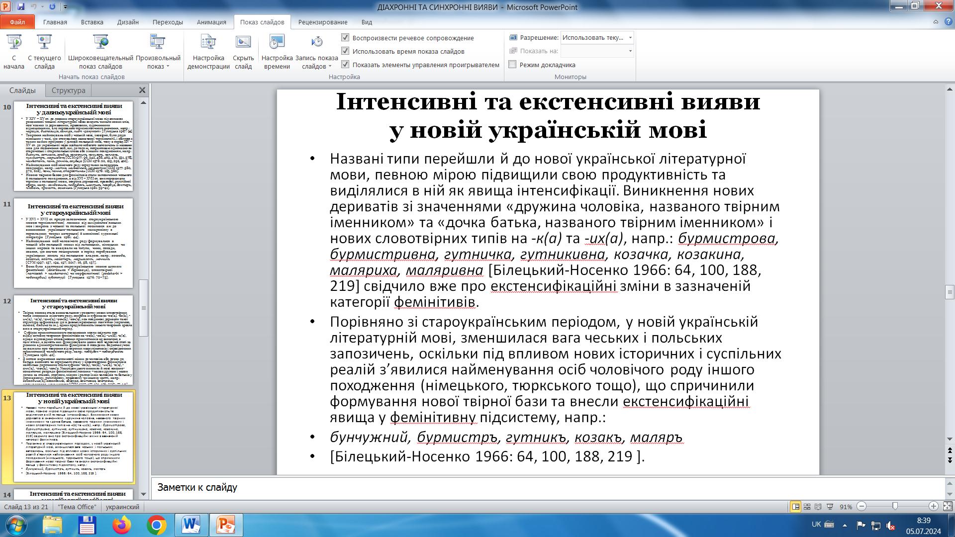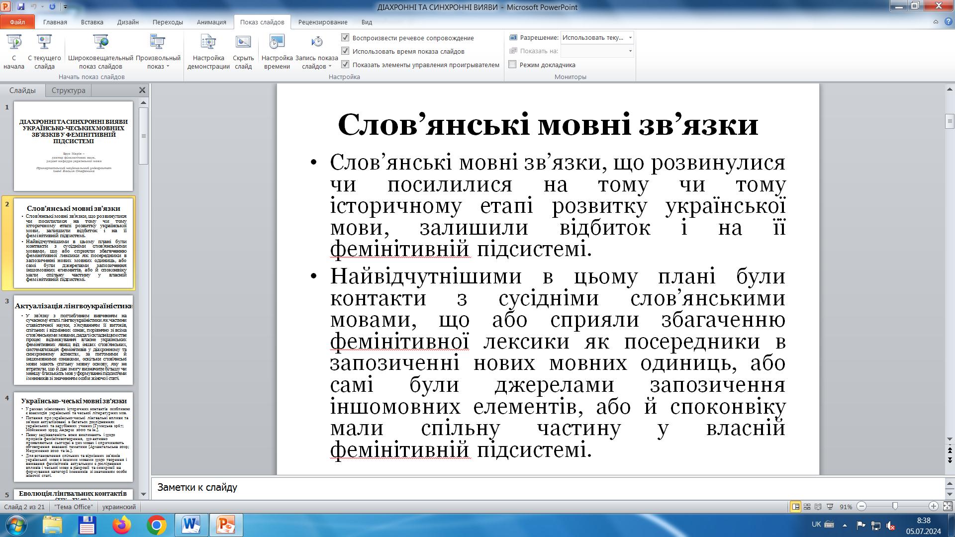 Доцентка розкрила питання про українсько-чеські мовні зв’язки і схарактеризувала фемінітиви й маскулінативи чеського походження, що ввійшли до українського лексикону в різні історичні періоди, стали частиною його активного або пасивного складу та залишили певне відбиття на фемінітивній підсистемі української мови. Зазначила, що перші такі запозичення з чеської мови з’явилися в українській мові ХІV – ХV ст., збільшилися в ХVІ – ХVІІ ст., частково поповнили українську лексику в новий та сучасний періоди, але переважно словами, мотивованими основами чеського походження.