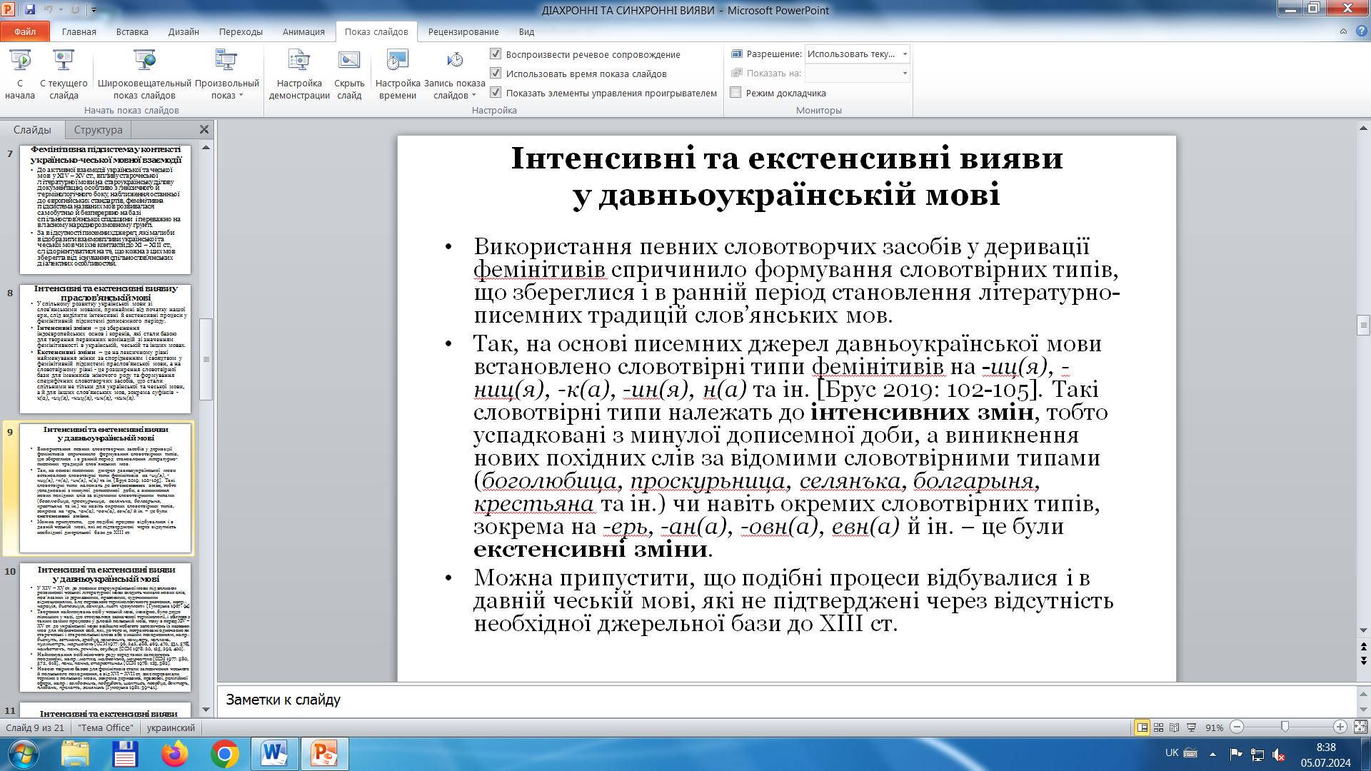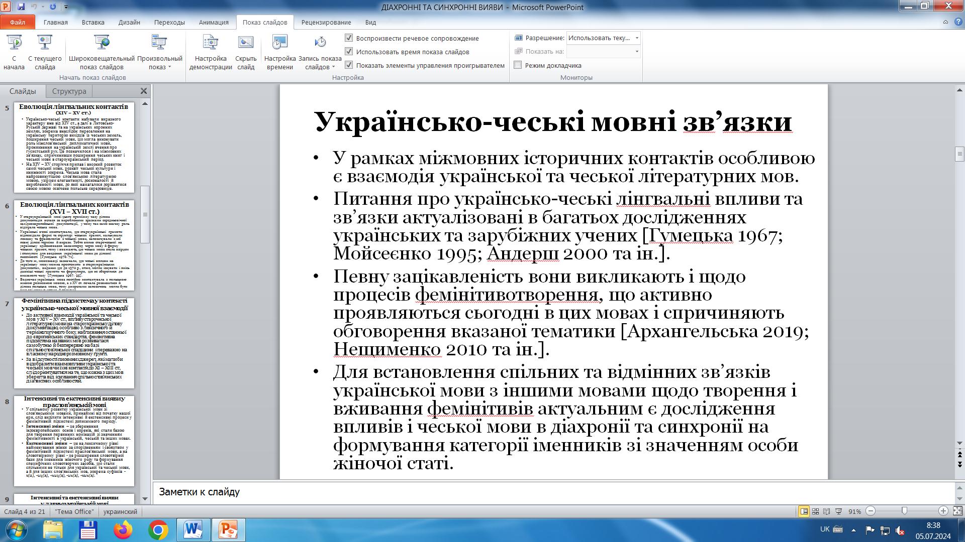 Проблема творення та вживання фемінітивів є сьогодні однією з актуальних у контексті становлення й розвитку міжмовної взаємодії, розкриття якої активізує певною мірою і міжнародну співпрацю та комунікацію. На чесько-українському рівні ця проблема не нова, а з тривалою історією, тому дослідження її уґрунтоване на використанні діахронного та синхронного підходів. Із погляду впливів чеської мови на фемінітивну підсистему української мови діахронний аспект дав змогу простежити хронологію запозичення із чеської мови фемінітивів або їхніх твірних основ упродовж усієї писемної доби, а синхронний – проаналізувати особливості запозичених номінацій із чеської мови на різних історичних етапах. Для реалізації цих підходів доповідачка використала історичний, порівняльний, описовий методи, елементи лексичного, словотвірного і стилістичного аналізу. За теоретичну базу взяла наукові праці з лінгвоукраїністики про чесько-українські мовні зв’язки та фемінітивні запозичення з чеської мови, а за основну джерельну базу – історичні й тлумачні словники української мови.