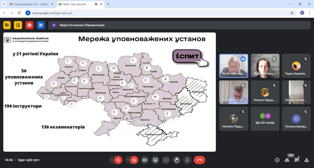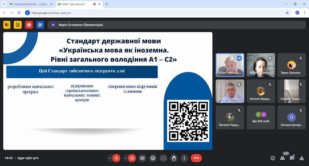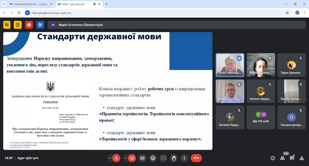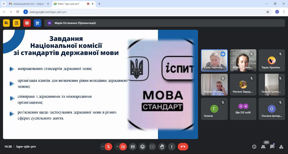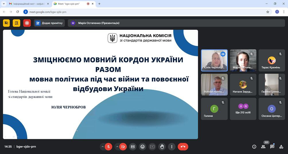 «Мовна політика під час війни та повоєнної відбудови України: інститути держави, українська наукова спільнота і громадськість». Лектори – Уповноважений із захисту державної мови кандидат філологічних наук, доцент Т.Д.Кремінь; голова Національної комісії зі стандартів української мови кандидат філологічних наук Ю.А.Чернобров;