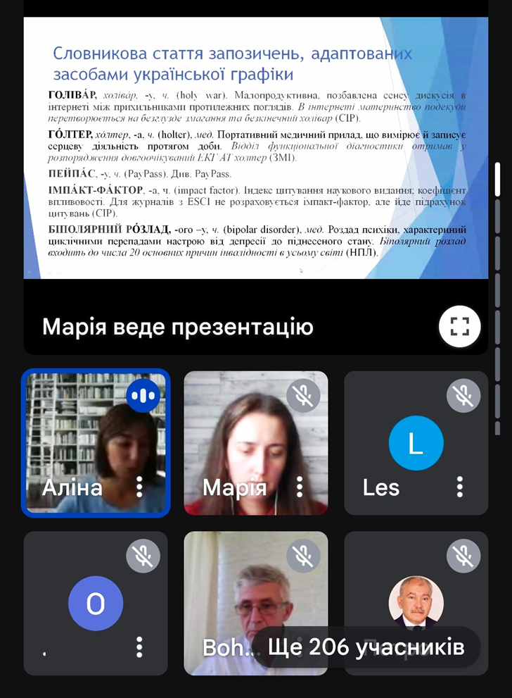 Учасники прослухали лекцію «Новітні запозичення з англійської мови (на матеріалі словника новітніх англізмів)». Лектори – кандидат філологічних наук, науковий співробітник Л. Л. Белей; кандидат філологічних наук, учений секретар Інституту мовознавства імені О. О. Потебні НАН України А. В. Гончаренко.