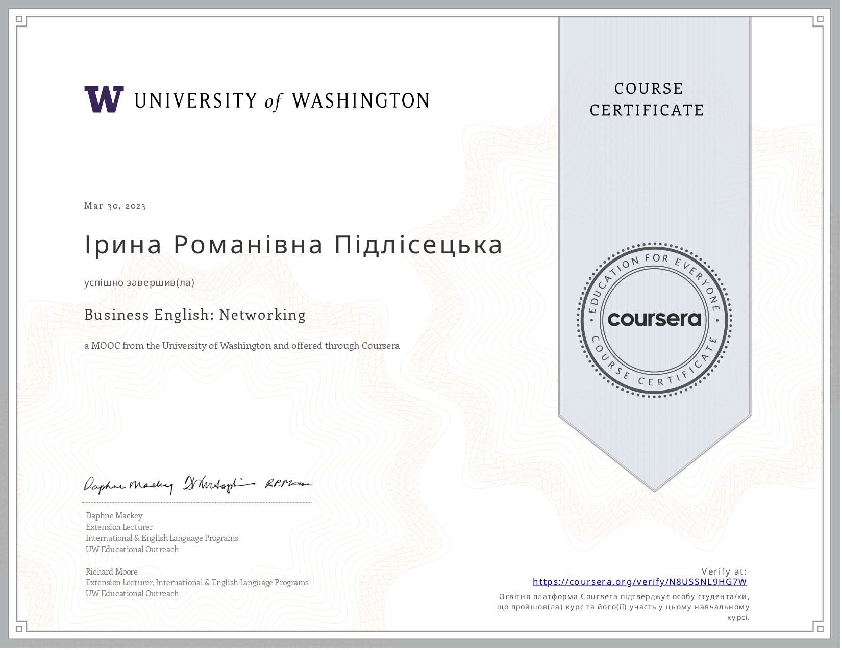 Студентка 1 курсу спеціальності 035 Філологія (Українська мова та література) ОР Магістр засвоїла курс Business English: Networking.