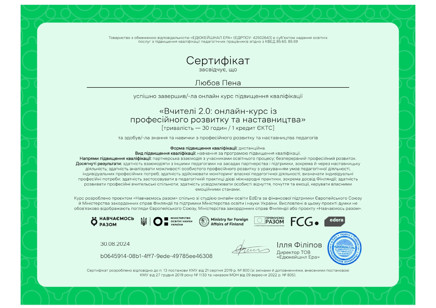 Кандидатка філологічних наук, доцентка Пена Любов Іванівна пройшла онлайн-курси: «Вчителі 2.0: онлайн-курс із професійного розвитку та наставництва» й «Психолого-педагогічні та методико-реабілітаційні засади інклюзивності суспільства у воєнній і повоєнній Україні».