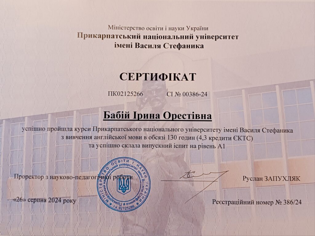 Жов 01 ДОСЯГНЕННЯ ВИКЛАДАЧІВ Вітаємо доцентку кафедри Ірину Бабій з успішним завершенням першого року університетських курсів з вивчення англійської мови, складенням іспиту й отриманням сертифіката рівня А1. Бажаємо подальших успіхів!
