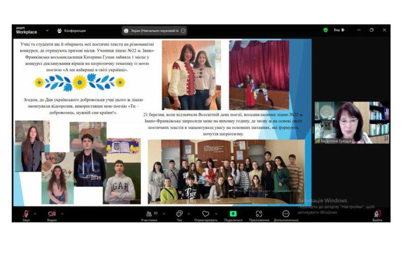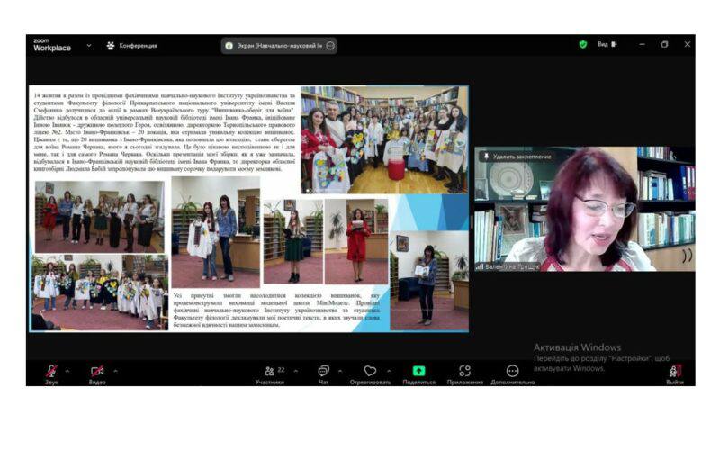 Учасники гостьової лекції із задоволенням слухали розповідь Валентини Василівни про її діяльність на шпальтах газети “Освітянське слово”, де опубліковані її поезії до Дня вчителя, Міжнародного дня рідної мови; участь у поетичному марафоні «Наші музи не мовчать! Разом до перемоги»; поетичні зустрічі разом зі студентами Факультету філології та провідними фахівчинями навчально-наукового Інституту українознавства на базі ліцеїв міста Івано-Франківська. Валентина Василівна розповідала про останні події, зокрема акцію в рамках Всеукраїнського туру “Вишиванка-оберіг для воїна”, яка відбувалася в обласній універсальній науковій бібліотеці імені Івана Франка.