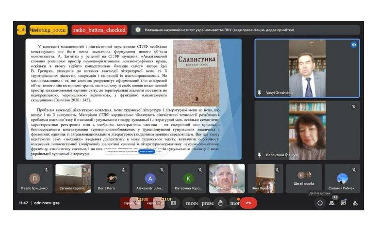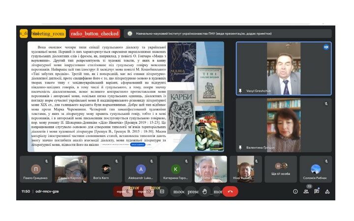 На пленарному засіданні із доповіддю “Можливості та лінгвістична перспектива словника «Гуцульська діалектна лексика та фраземіка в українській художній мові»” виступили доктор філологічних наук, професор кафедри української мови Прикарпатського національного університету імені Василя Стефаника Ґрещук Василь Васильович та кандидатка філологічних наук, доцентка кафедри української мови, директорка навчально-наукового Інституту українознавства Прикарпатського національного університету імені Василя Стефаника Ґрещук Валентина Василівна. Свої наукові напрацювання презентували: Єрмоленко Світлана Яківна (доктор філологічних наук, професор, академік НАН України, головний науковий співробітник відділу стилістики, культури мови та соціолінгвістики Інституту української мови НАН України (Київ) “Категорії книжності/розмовності в сучасній лексикографічній практиці”; Городенська Катерина Григорівна (доктор філологічних наук, професор, завідувач відділу граматики та наукової термінології Інституту української мови НАН України (Київ) “Новітні запозичення в системі словотворчих засобів української літературної мови ХХІ ст.: статус і правопис”; Драгічевич Райна (доктор філологічних наук, професор Белградського університету (Сербія) “Назви кольорів у сербському та українському асоціативному словнику”. Після зголошення усіх доповідей учасники розпочали жваву дискусію.