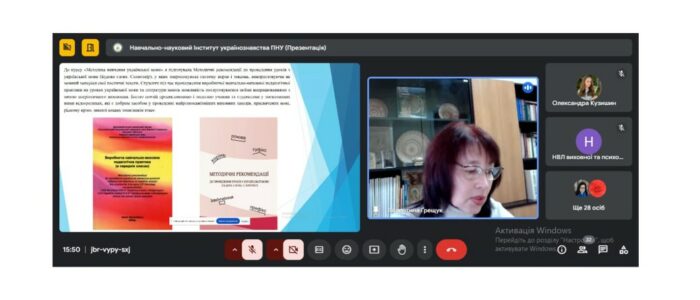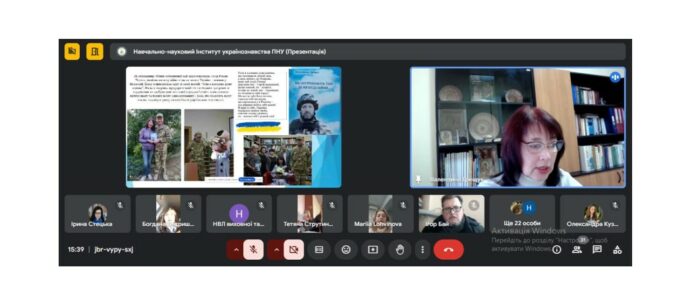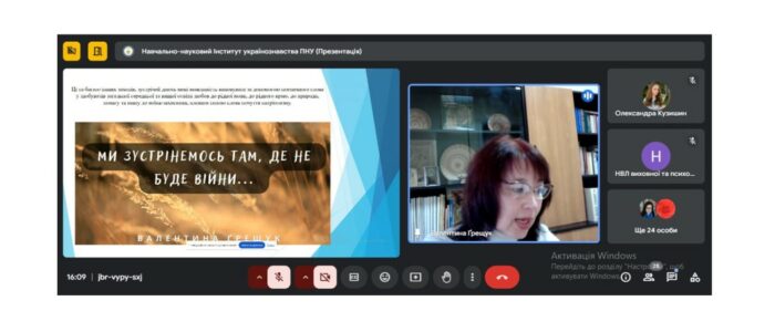 На семінарі із доповіддю «Патріотичне виховання здобувачів загальної середньої та вищої освіти засобами поетичного тексту» виступила кандидатка філологічних наук, доцентка кафедри української мови, директорка навчально-наукового Інституту українознавства Ґрещук Валентина Василівна, яка окреслила основні аспекти патріотичного виховання молоді засобами поетичного тексту на прикладі своєї збірки «Ми зустрінемось там, де не буде війни…» та на прикладі тих поезій, які готує до нової збірки. Валентина Василівна ознайомила усіх присутніх зі своєю поетичною збіркою, своєю творчістю; закцентувала увагу на самому понятті «патріотизму» та важливості патріотичного виховання у закладах загальної середньої та вищої освіти; основну увагу зосередила на методичній цінності поетичних текстів, які студенти Факультету філології використовують на заняттях зі «Стилістики і культури української мови» та «Методики вивчення української мови» як ілюстративний матеріал.