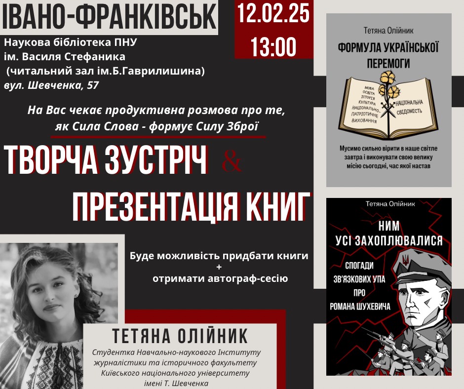 12 лютого о 13:00 год у Науковій бібліотеці ПНУ ім. Василя Стефаника (читальний зал ім. Б. Гаврилишина, вул. Шевченка, 57) відбудеться презентація книг: «Ним усі захоплювалися: спогади зв’язкових УПА про Романа Шухевича»; «Формула Української Перемоги». Авторка – Тетяна Олійник, студентка Читати далі