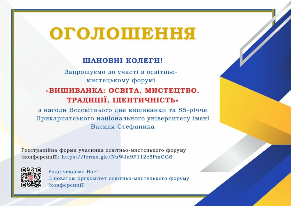 Із нагоди Всесвітнього дня вишиванки та 85-річчя Прикарпатського (Карпатського) національного університету імені Василя Стефаника запрошуємо взяти участь в освітньо-мистецькому форумі «ВИШИВАНКА: ОСВІТА, МИСТЕЦТВО, ТРАДИЦІЇ, ІДЕНТИЧНІСТЬ». Календар подій форуму: 15 травня 2025 року VI Міжнародна науково-практична конференція «Україно моя вишивана: освітньо-виховний Читати далі