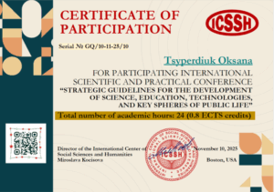 Студентка групи СОА-17 Аліна Жага разом зі своєю науковою керівницею підготували виступ «Суржик – ворог чи ресурс? Мовна гігієна сучасної української школи» на Міжнародну науково-практичну конференцію «Стратегічні орієнтири розвитку науки, освіти, технологій та ключових сфер суспільного життя», що відбулася 10 листопада 2025 р. в м. Бонстон, США. Стислий виклад доповідей і повідомлень учасників конференції опубліковано в науковому збірнику: https://www.economics.in.ua/2025/11/10.html