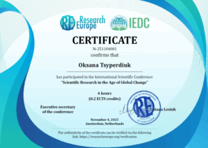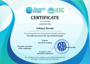 Студентка групи СОА-17 Юліана Нірода та її наукова керівниця Оксана Ципердюк підготували доповідь «Мовний образ України в поезіях Ірини Сеник» на Міжнародну наукову конференцію «Наукові дослідження в епоху глобальних змін», яка відбулася 4 листопада 2025 р. в м. Амстердам, Нідерланди. З тезами виступу можна ознайомитися за покликанням: https://doi.org/10.64076/iedc251104.19